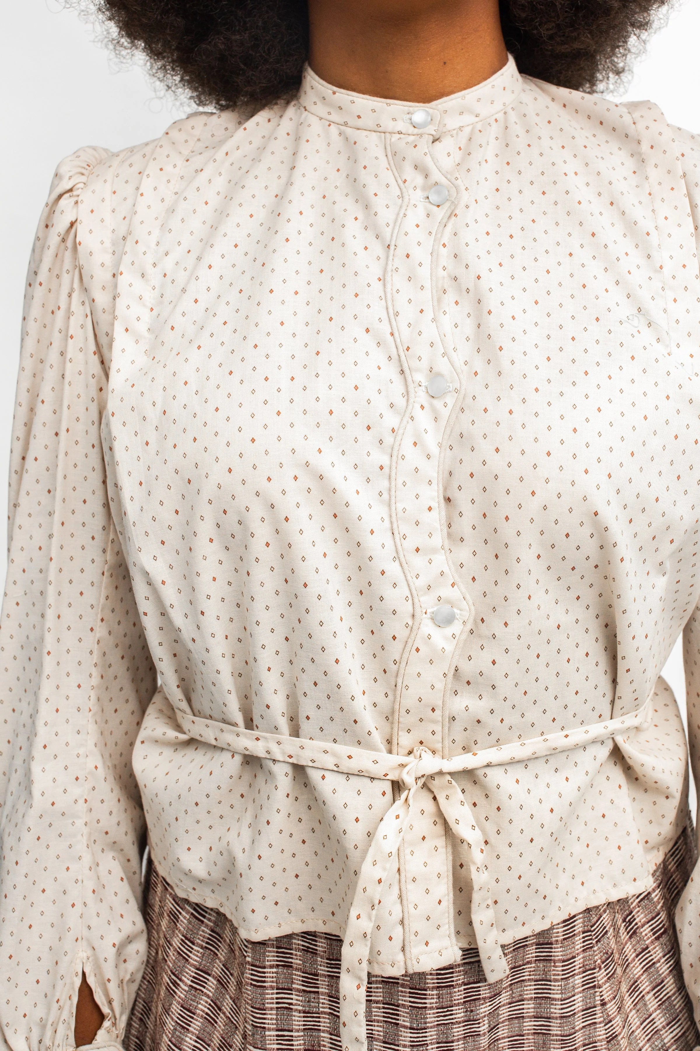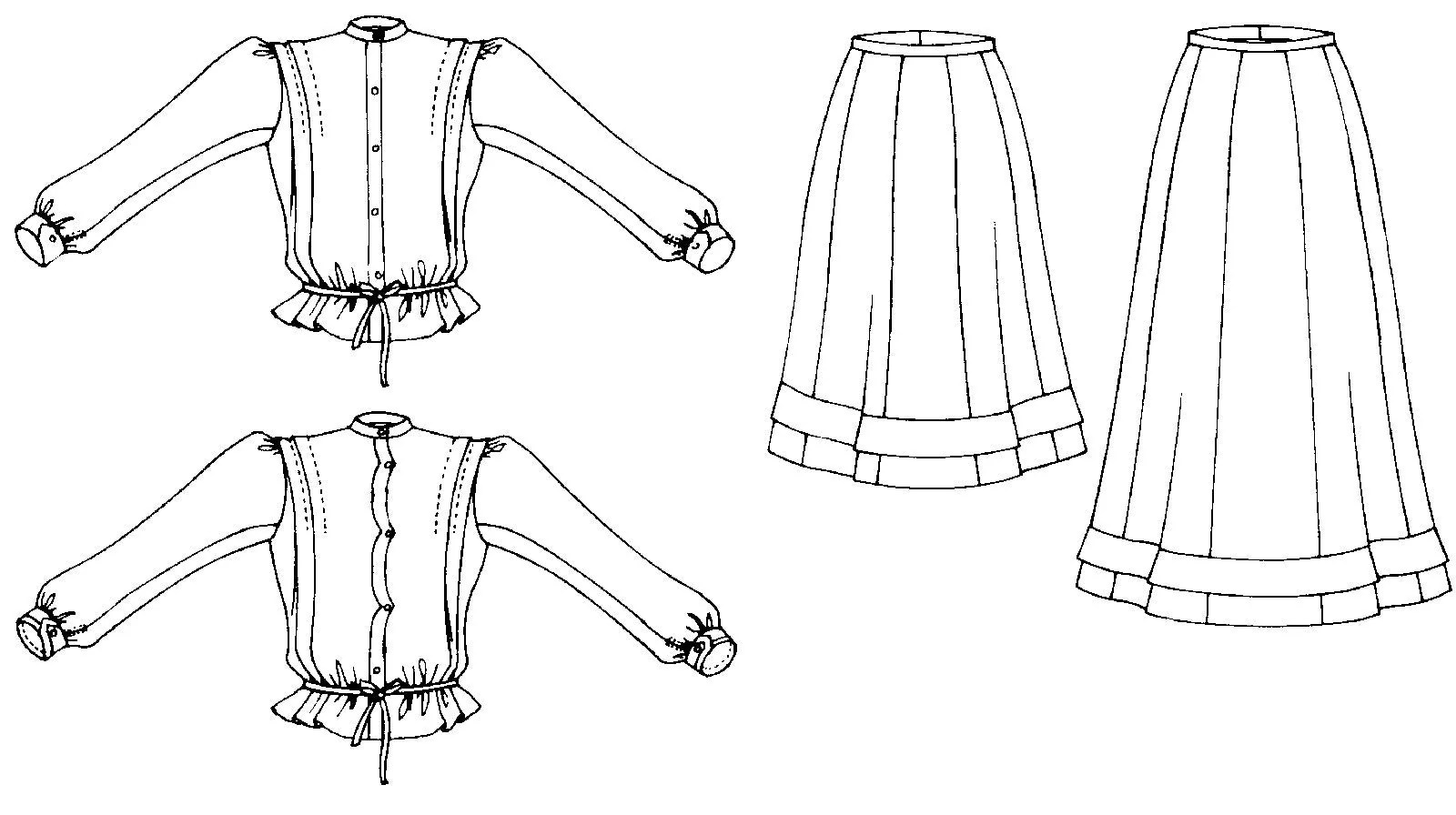 Our Schoolmistress Shirtwaist & Skirt sewing pattern dates from about 1907, a period when women's clothing became more man-tailored. This pattern was taken from a matched set made in white cotton with black threads woven to form tiny squares. The skirt features bias trim detailing at the hem, which also trims the cuffs and front opening of the blouse.