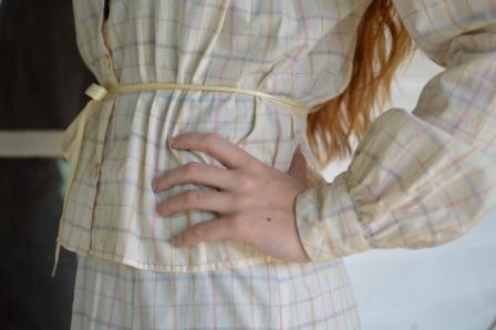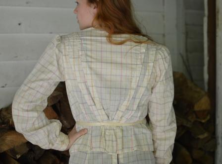 The elegant princess line in the back of the Shirtwaist is accented by two wide tucks that extend over the shoulders to the front. A pretty scalloped front opening and gathers at the back waist soften the silhouette ( a simpler straight front placket is optional). Moderately full set-in sleeves gather neatly into buttoned cuffs. Bias details may be done on the straight grain of the same or contrasting fabric, or omitted altogether.