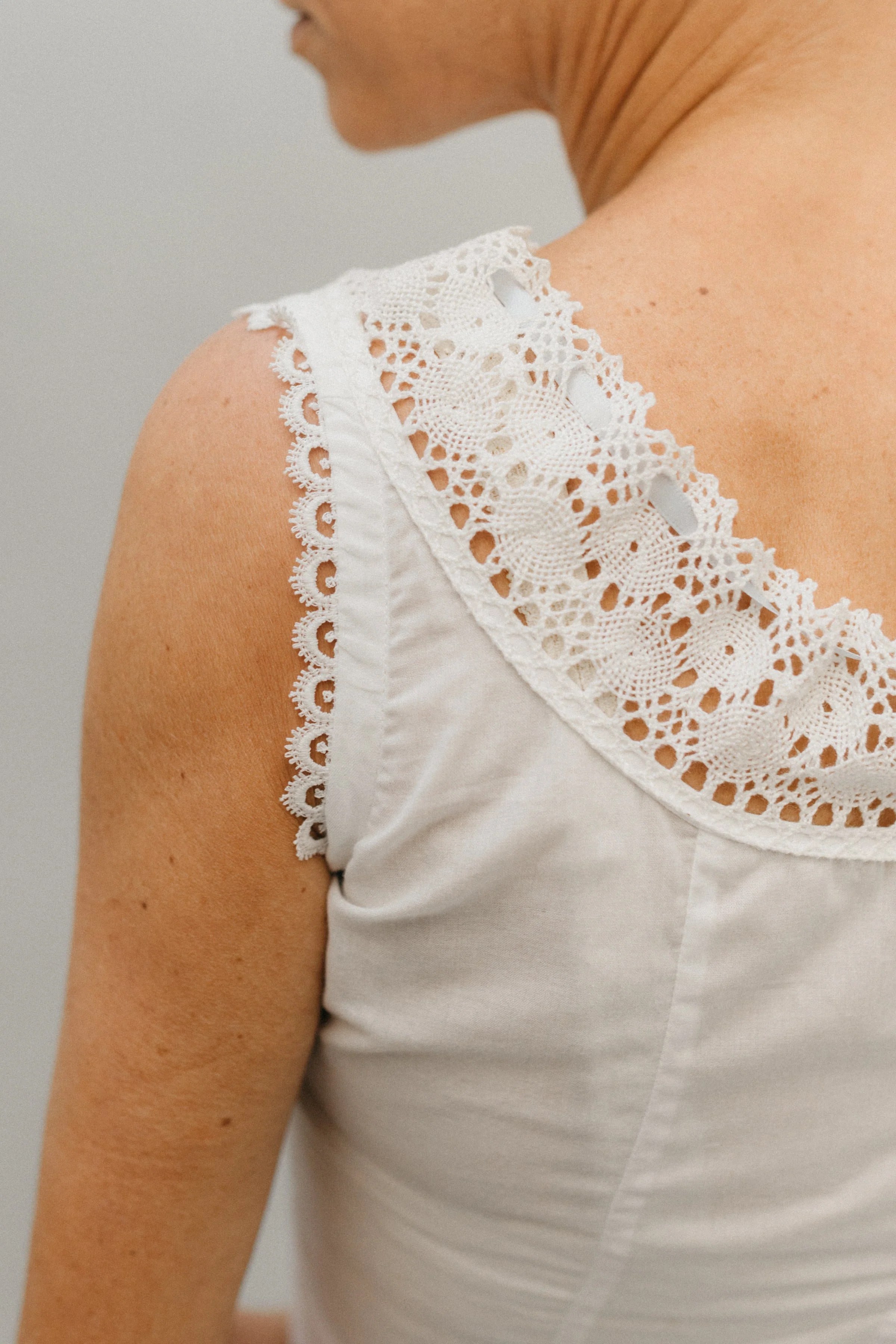 Classic princess seams provide a smooth shape and flattering fit. The neckline is encircled by a row of wide crocheted lace with a narrow ribbon drawstring. Bias binding faces the lace-trimmed armholes. The traditional concealed buttoned placket closes the back, or you may use a zipper.
