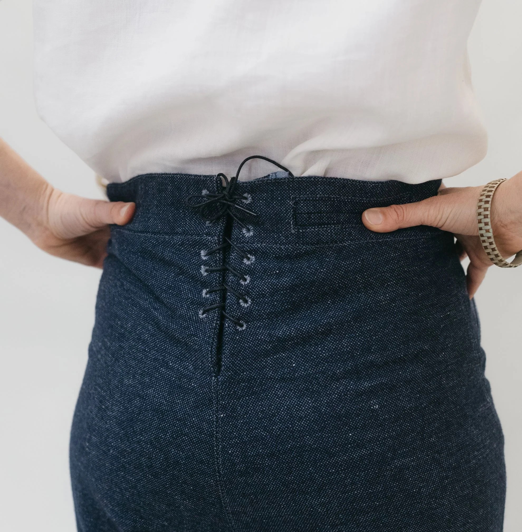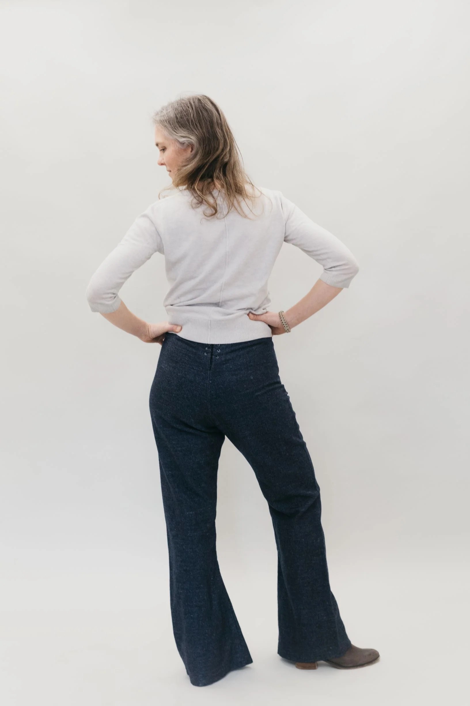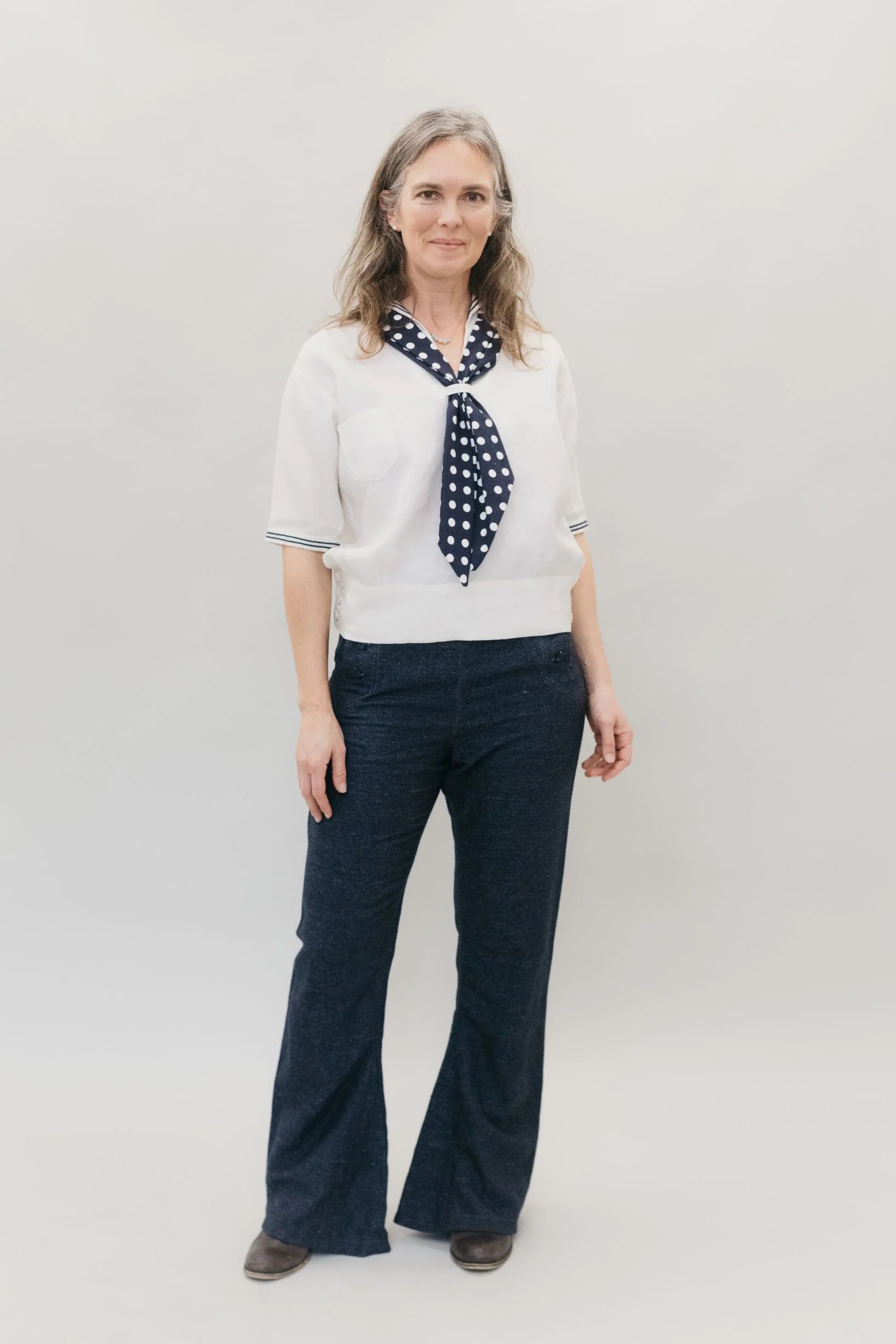 Our Sailor Pants originate from those worn by WWII Navy seamen. This style and design have been worn as part of the Navy uniform, or "Crackerjack" uniform, for many decades; and the nautical style influenced fashion for more than half a century. These iconic high-waisted bell bottom pants are loaded with all the elements and details of the original, such as the distinctive buttoned front flap closure, lace-up back eyelet gusset, back welt pocket, and inner leg godet. A small hidden coin pocket is tucked neatly in the front waistband seam. All the details of this pants design reflect the practical sensibilities of a uniform combined with a casual sophistication that remains timeless.