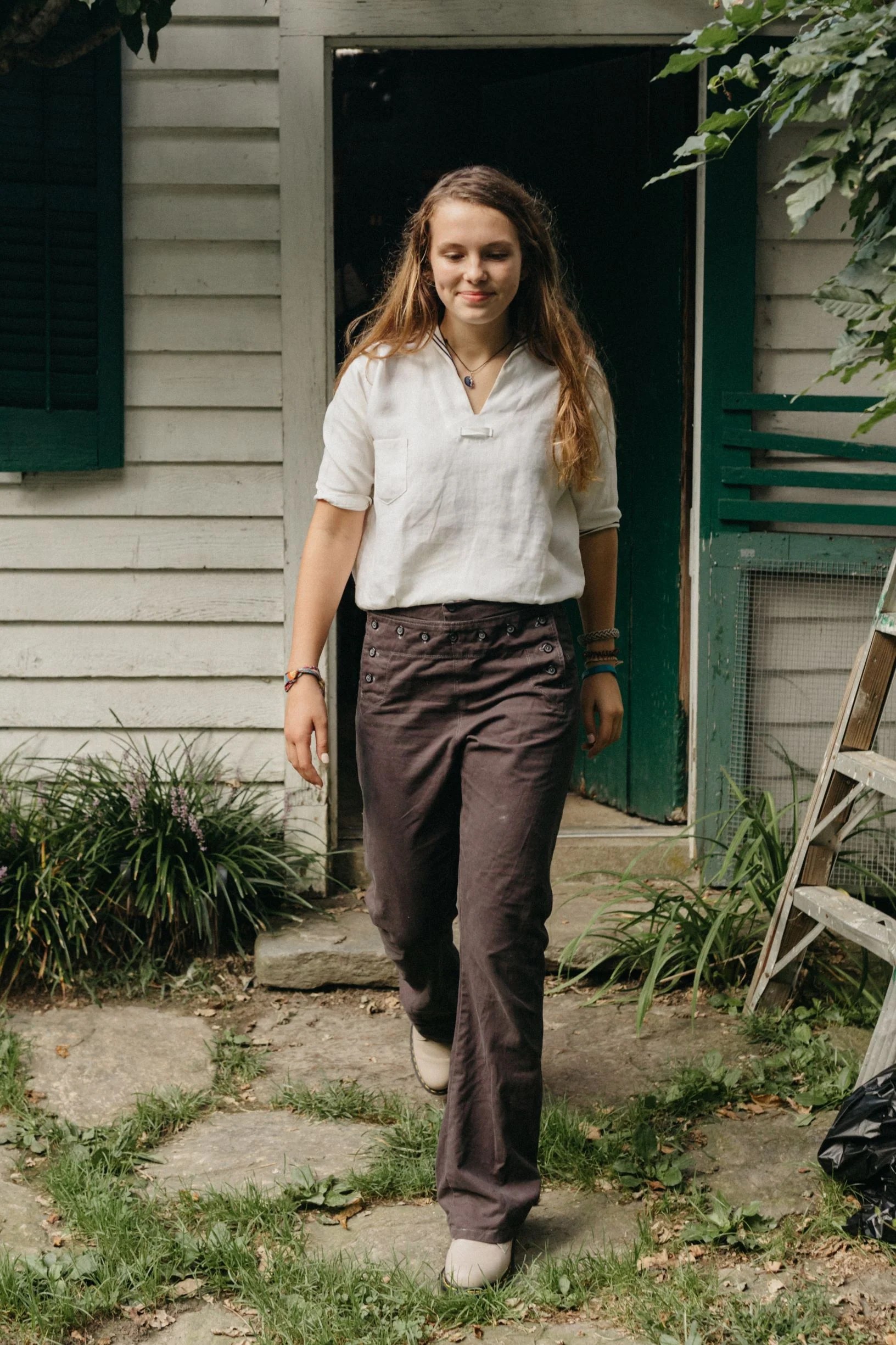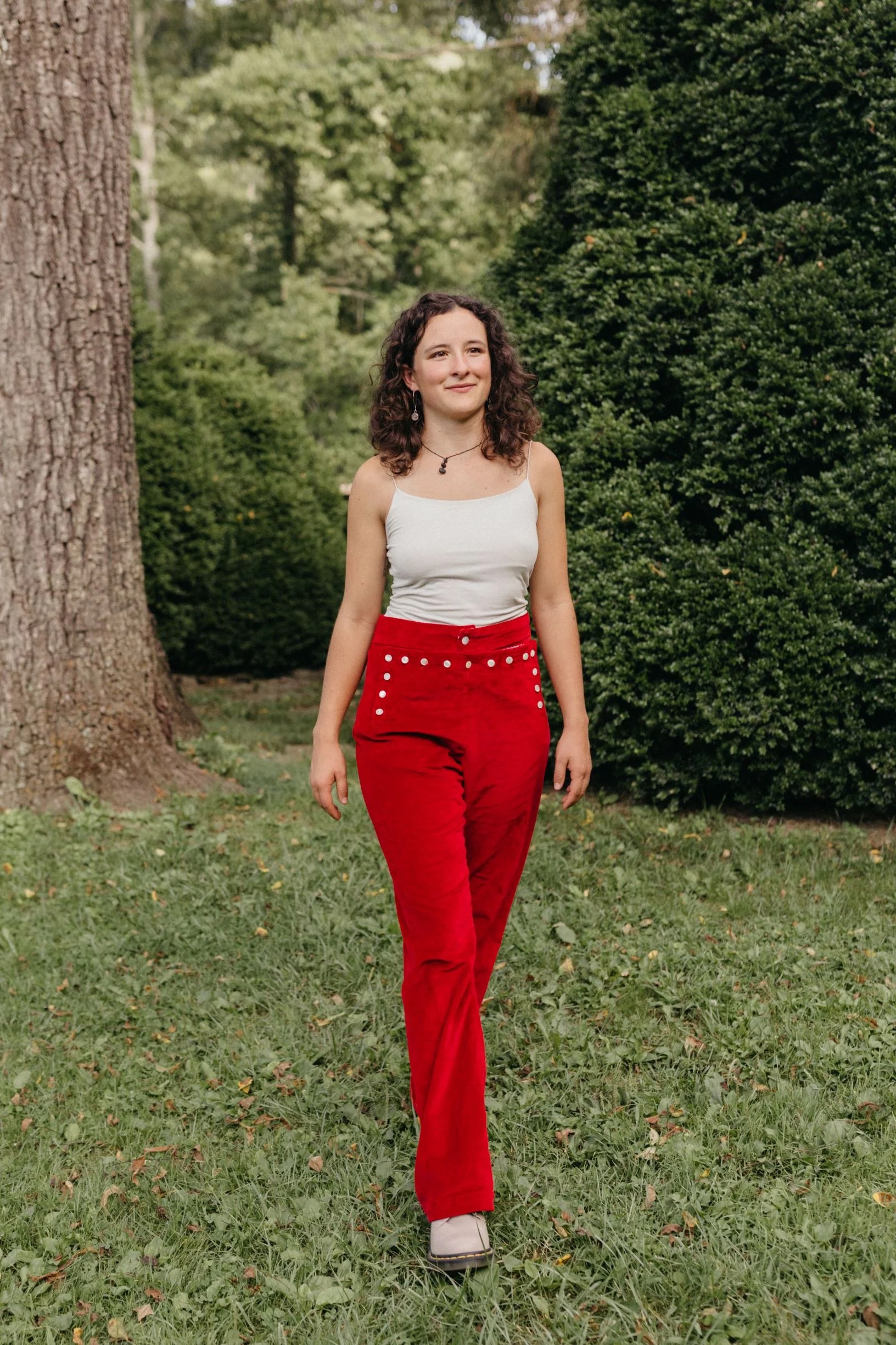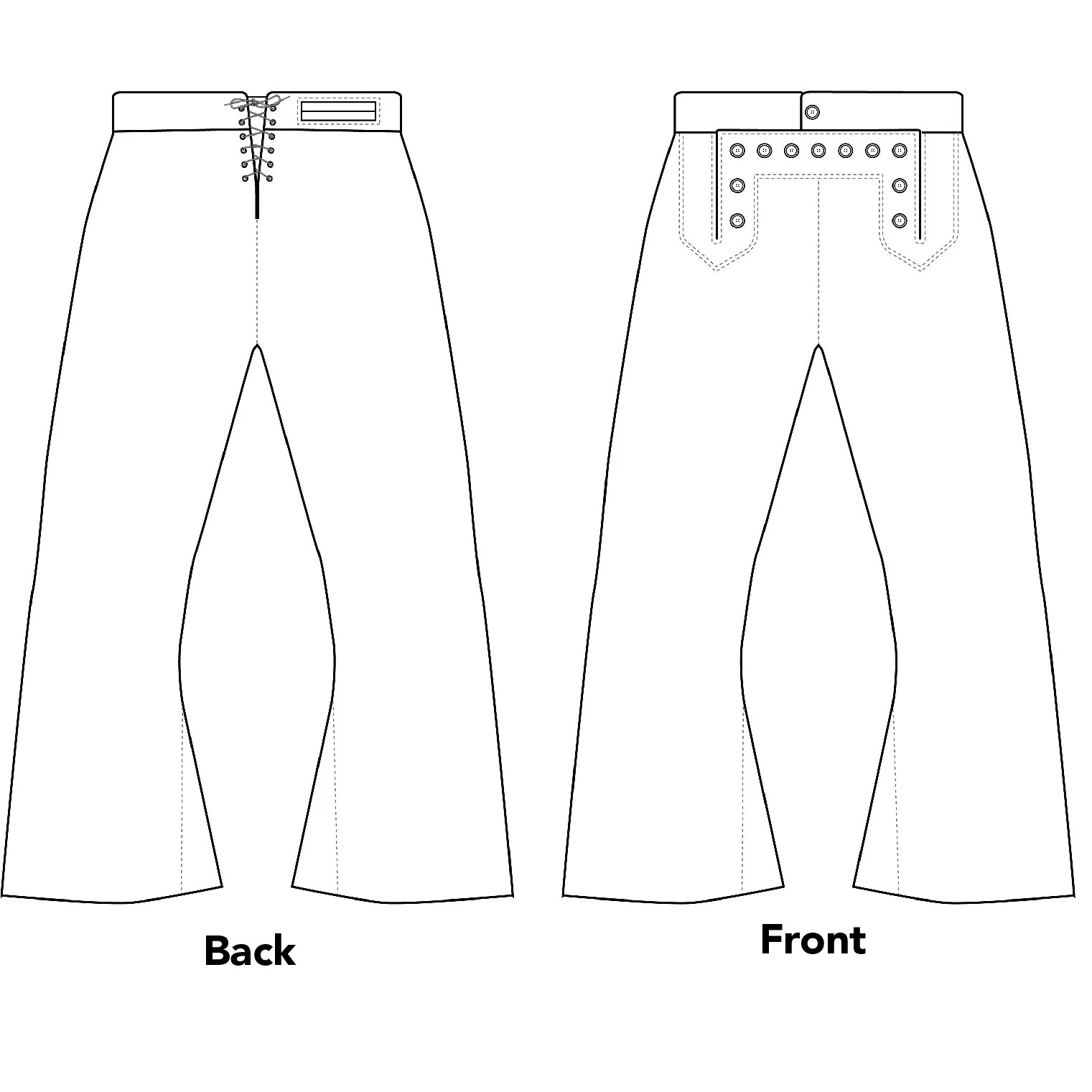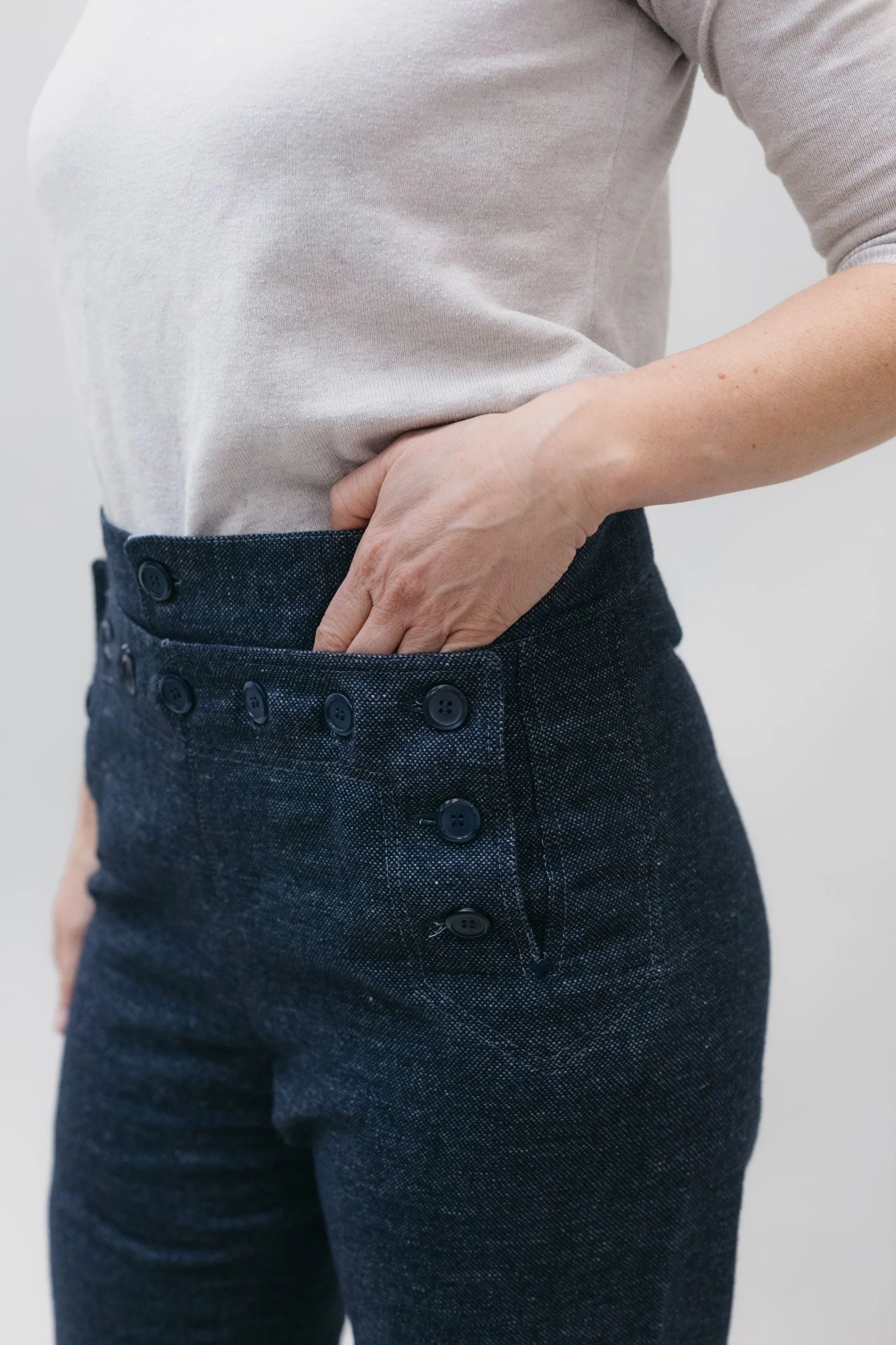 Our Sailor Pants originate from those worn by WWII Navy seamen. This style and design have been worn as part of the Navy uniform, or "Crackerjack" uniform, for many decades; and the nautical style influenced fashion for more than half a century. These iconic high-waisted bell bottom pants are loaded with all the elements and details of the original, such as the distinctive buttoned front flap closure, lace-up back eyelet gusset, back welt pocket, and inner leg godet. A small hidden coin pocket is tucked neatly in the front waistband seam. All the details of this pants design reflect the practical sensibilities of a uniform combined with a casual sophistication that remains timeless.