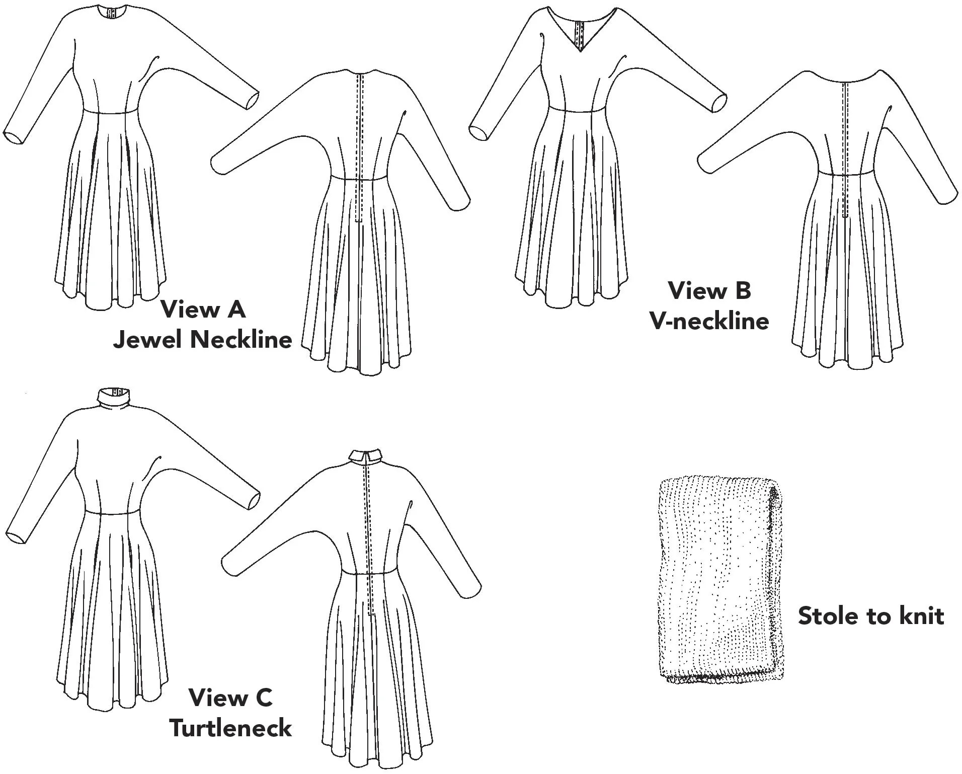 Dolman sleeves, fitted waist, and a gored circular skirt compliment most figures now as then. For all-season day and night versatility we offer three neckline treatments: a refined jewel neck to show off your favorite necklace (in the 50’s, pearls!); an elegant wide V; and a classic turtleneck. Jewel or turtleneck versions go through fall and winter in wool crepe, jersey, challis, or other soft fabrics. The V neck dress is picture perfect in a flowery cotton print for summer, or in taffeta for holiday parties. Your favorite wide belt or self-covered belt (instructions included) created the perfect accent. There are even pockets hidden in the front gores. To echo the original retro feeling, exaggerate fullness with several stiff petticoats; for a contemporary look, let the skirt swing free!