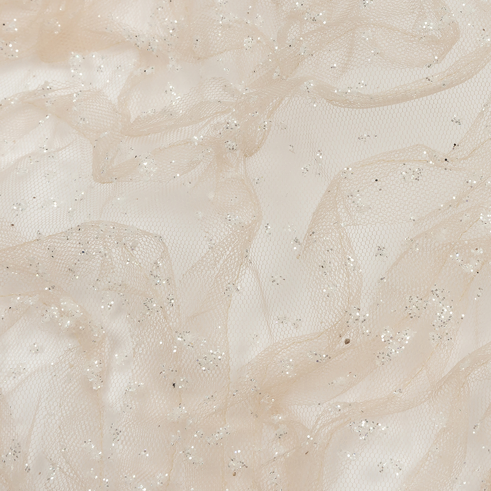 Feel like a blossoming rose with this flirty Champagne 3D Fabric Roses Glitter Tulle! Featuring a slight mechanical give, tactile hand, and voluminous drape.Suggested Projects: Dresses, Tutus, Shawls, SkirtsContent: 100% PolyesterStretch: Slight Mechanical GiveOpacity: TranslucentDelicate and lightweight, the fabric displays ruched dimensional champagne-colored rose forms carefully sewn onto the surface of the champagne-toned tulle and dusted with glittery spots. In addition to a slight mechanical give, the textile offers a crisp, tactile hand and a voluminous, flexible drape. Design breathtaking dresses, tutu or flared skirts, ball gowns, and elegant shawls as well! Translucent, an additional lining may be used for opacity and structure.