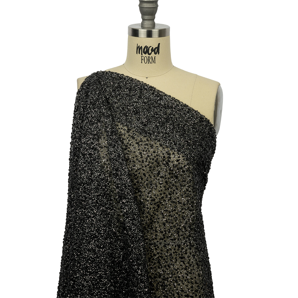 Become the night—stars and all—with this 3D Black Puffy Spots Glitter Tulle! Featuring a crisp, tactile hand and voluminous drape.Suggested Projects: Overlays, Eveningwear, Skirts, AccessoriesContent: 100% PolyesterStretch: NoneOpacity: SheerAn array of puffy spots topped with brilliant glitter spread across a soft black tulle base. With a crisp, textural hand and voluminous drape, this tulle is ideal for overlays on evening gowns, two-piece special occasion outfits, tutu dresses, dance costumes, veils, hair accessories, and more. Sheer, a lining is recommended where opacity and comfort in wear are desired.Please Note: This fabric may come with a protective plastic backing that should be removed before use by gently pulling the plastic away from the fabric.
