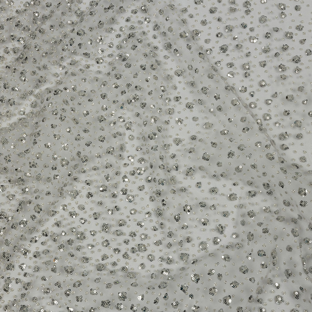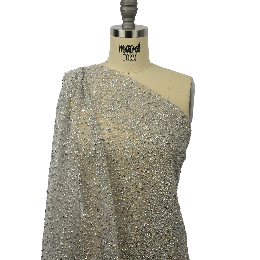 You’ll be blinded by the light of this 3D Light Gray Puffy Spots Gradient Glitter Tulle. Featuring a flexible drape and tactile hand.Suggested Projects: Tutus, Dresses, Eveningwear, CostumesContent: 100% PolyesterStretch: NoneOpacity: SheerWhite and silver starry sparkles fall down from the skies and onto this light gray tulle. Of a medium weight due to its embellishments, the intricate material features a flexible drape and delightfully textural hand. About half the width is made up of puffy silver glitter-covered dots in close proximity, while the other half features the same dots spreading further and further apart, all atop a light gray ground. Get showered with sparkles and compliments when crafting this glitter tulle into a tutu or asymmetrical skirt, a ball gown, or a costume for a spectacular event! Since it is fairly translucent, adding a solid lining is kindly recommended.Please Note: This fabric may come with a protective plastic backing that should be removed before use by gently pulling the plastic away from the fabric.
