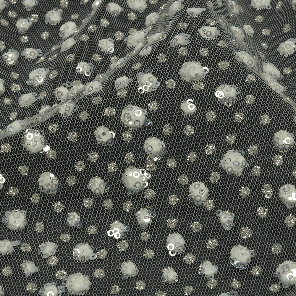 Dance among the stars with this 3D White Puffy Spots Gradient Glitter Tulle. Featuring a flexible drape and tactile hand.Suggested Projects: Tutus, Dresses, Eveningwear, CostumesContent: 100% PolyesterStretch: NoneOpacity: SheerWhite starry sparkles fall down from the skies and onto this white tulle. Of a medium weight due to its embellishments, the intricate material features a flexible drape and delightfully textural hand. About half the width is made up of puffy white and silver glitter-covered dots in close proximity, while the other half features the same dots spreading further and further apart, all atop a white ground. Get showered with sparkles and compliments when crafting this glitter tulle into a tutu or asymmetrical skirt, a ball gown, or a costume for a spectacular event! Since it is fairly translucent, adding a solid lining is kindly recommended.Please Note: This fabric may come with a protective plastic backing that should be removed before use by gently pulling the plastic away from the fabric.