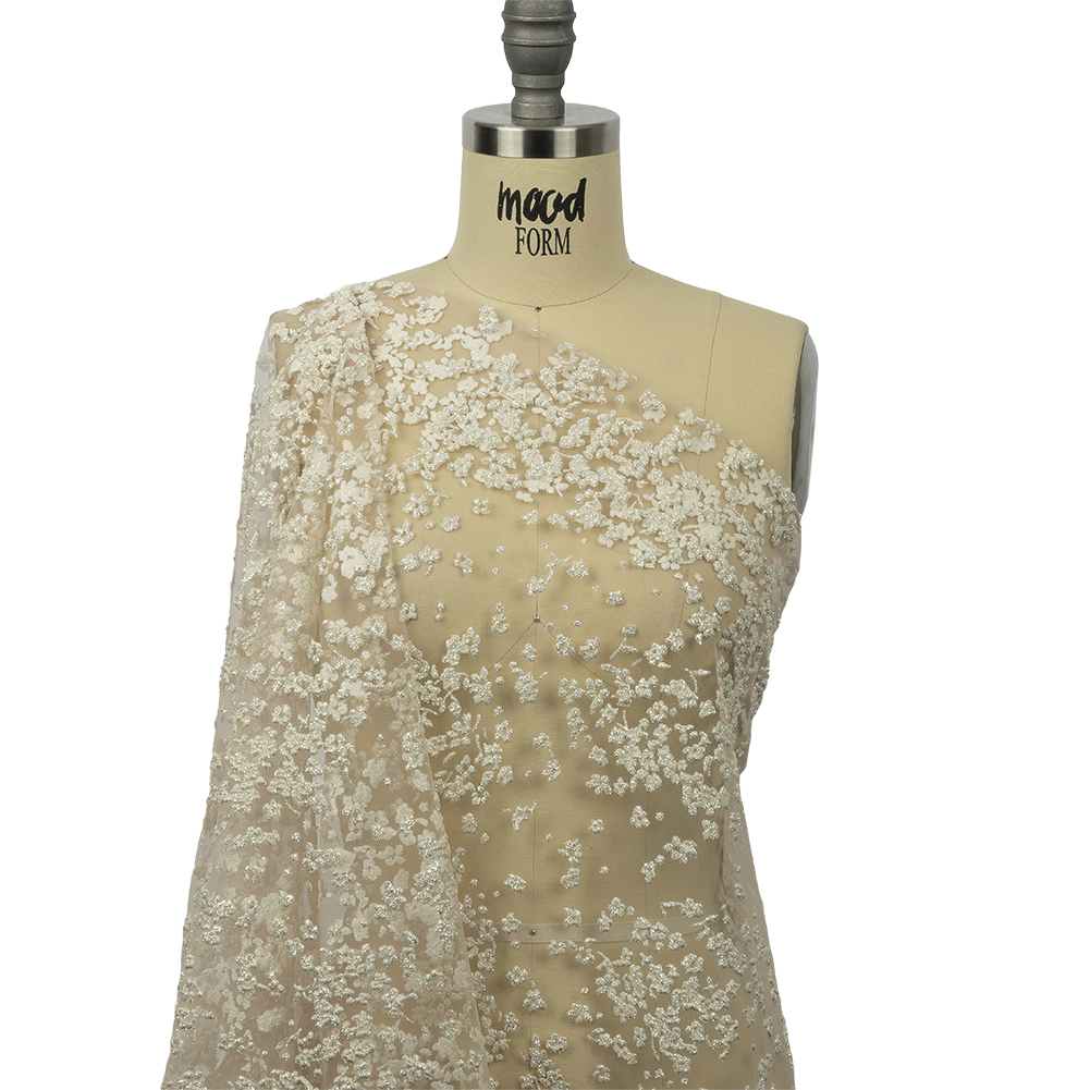 Whimsical, tiny white flowers made of sparkling snow appear on the runway with this 3D Champagne and White Floral Puffy Glitter Tulle. Featuring a billowing drape and soft, crisp hand.Suggested Projects: Dresses, Eveningwear, Bridal WearContent: 100% PolyesterStretch: NoneOpacity: SheerPour yourself a flute of this champagne and white floral tulle. While the champagne-colored tulle base offers a soft, crisp hand, it's interrupted by a dimensional white floral design and silver glitter finish to add exceptional texture. Lightweight, it moves with a billowy drape and soft volume. Shine bright by adding this to a couture-styled dress or skirt, or creating an embellished shawl or wrap for your next formal dinner party! Layer it over a brilliant silk lining to compliment the tulle's sheerness and add comfort in wear.Please Note: This fabric may come with a protective plastic backing that should be removed before use by gently pulling the plastic away from the fabric.