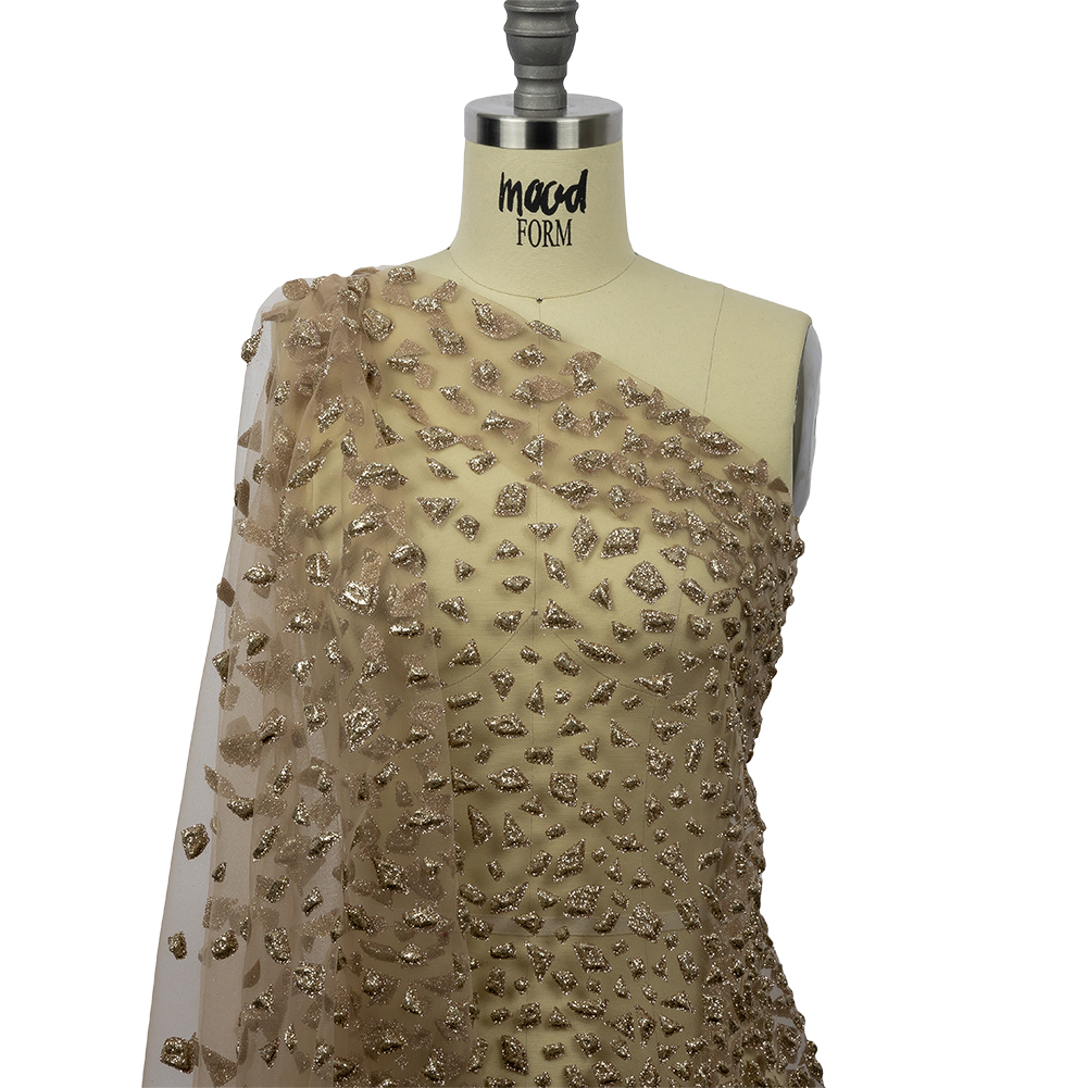 Earth tones, meet glitter in this 3D Mink Geometric Gradient Puffy Glitter Tulle! Featuring a tactile, crisp hand and malleable drape.Suggested Projects: Overlays, Eveningwear, Skirts, DressesContent: 100% PolyesterStretch: NoneOpacity: SheerThe gray-brown tulle base shines with an array of dimensional geometric puffs that are more densely packed on one edge than the other, topped with matching glitter. With a highly textured and crisp hand and a malleable drape, create overlays on evening gowns, tulle skirts, tutu dresses, prom dresses, and dance costumes, or use it for voluminous accent sleeves, veils, and more. Sheer, a lining is recommended for comfort and opacity where desired. Please Note: This fabric may come with a protective plastic backing that should be removed before use by gently pulling the plastic away from the fabric.