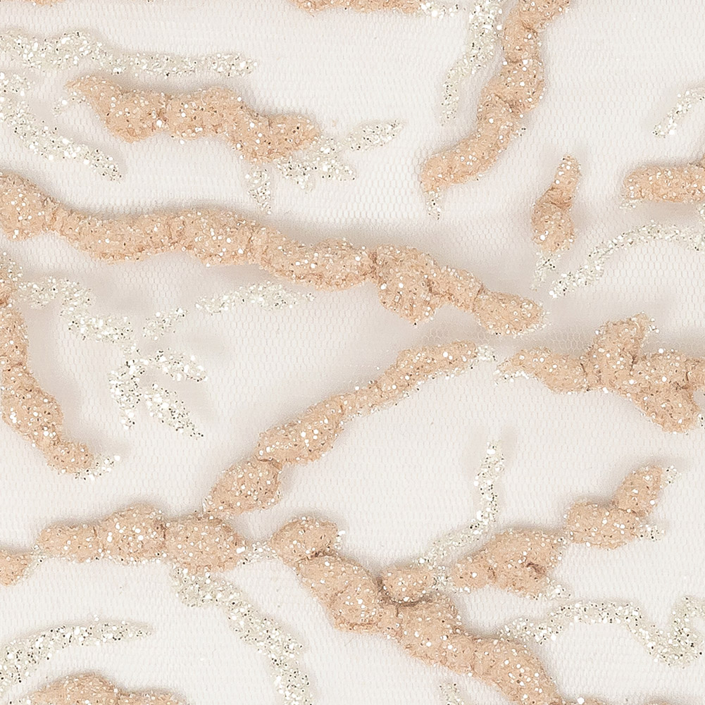 Just pink of all the things you could create with this 3D Powder Pink and Silver Puffy Glitter Tulle, featuring an airy drape and tactile hand.Suggested Projects: Overlays for Gowns, Jackets, and SkirtsContent: 100% PolyesterStretch: NoneOpacity: Mostly TransparentSpongy, wavy puffs of powder pink and silver grow from a ground of delightfully crisp tulle, everything encrusted with glitter. With a drape that is at once stiff and airy, this material is ideal for statement pieces. Fashion a gown with a layer of this over many layers of solid tulle for maximum fluff, or create sparkling overlays on jackets, skirts, dresses, and accessories. Mostly transparent, a lining is necessary for most applications.