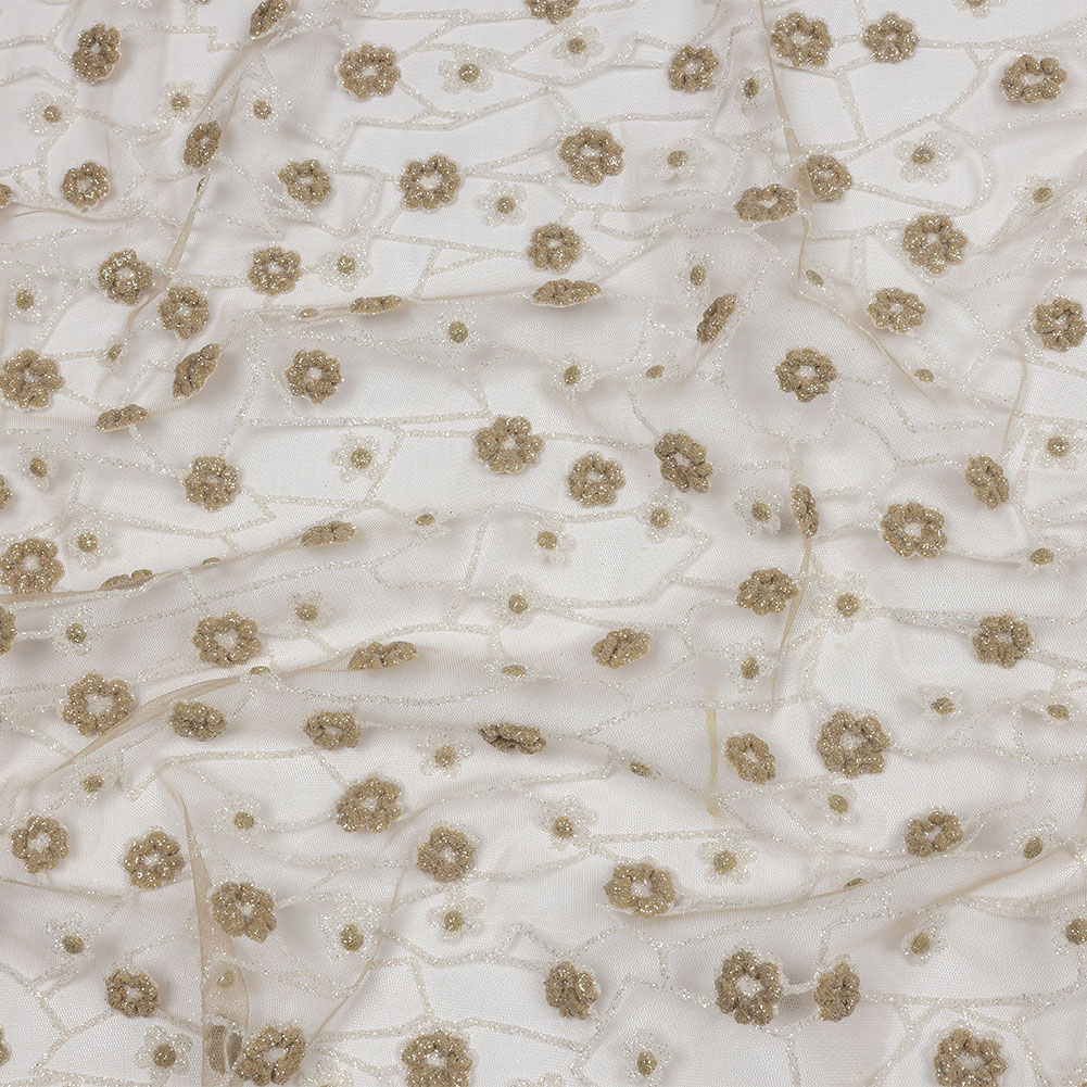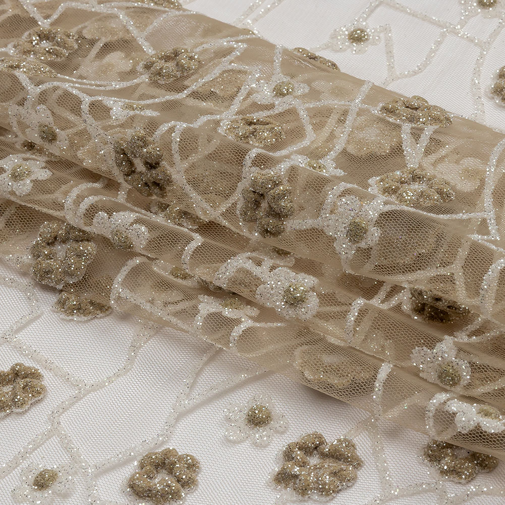 Stand tall and elegant in this 3D Taupe and White Flowers and Geometric Stems Puffy Glitter Tulle! Featuring a slight mechanical give, crisp hand and flexible drape.