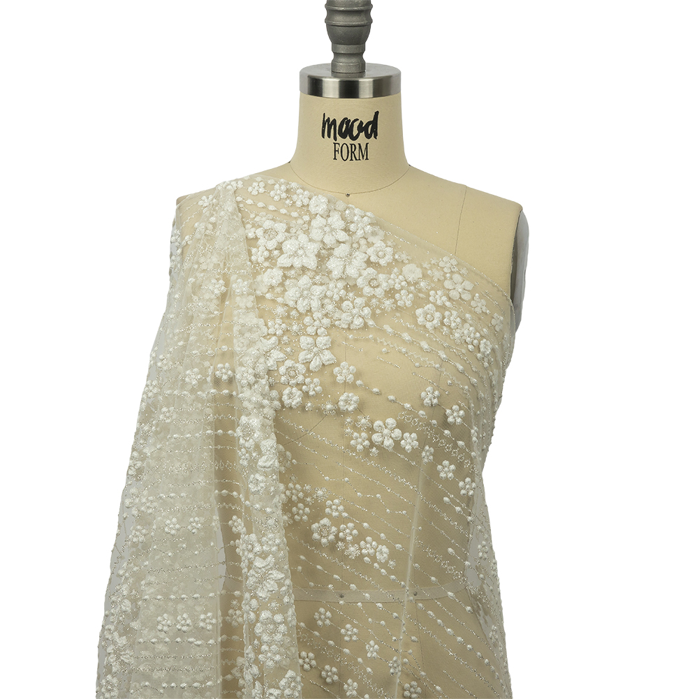 Become the dreamiest winter bride with help from this 3D White and Silver Dotted Stripes and Floral Border Puffy Glitter Tulle! Featuring a crisp, tactile hand and flexible drape.Suggested Projects: Skirts, Formal Wear, Bridal WearContent: 100% PolyesterStretch: NoneOpacity: SheerLet sparkles reign with this sheer tulle featuring an intricate cascade of dimensional white flowers and long, silver-white strands of tiny flowers and pearls hanging down across the width. Crisp and highly textural in hand, the delicate material offers a flexible drape and a mechanical give throughout. Embrace the glitter and couture glamor and create a voluminous skirt, elegant veil, extravagant gown, or luxury shawl for formal events!Please Note: This fabric may come with a protective plastic backing that should be removed before use by gently pulling the plastic away from the fabric.