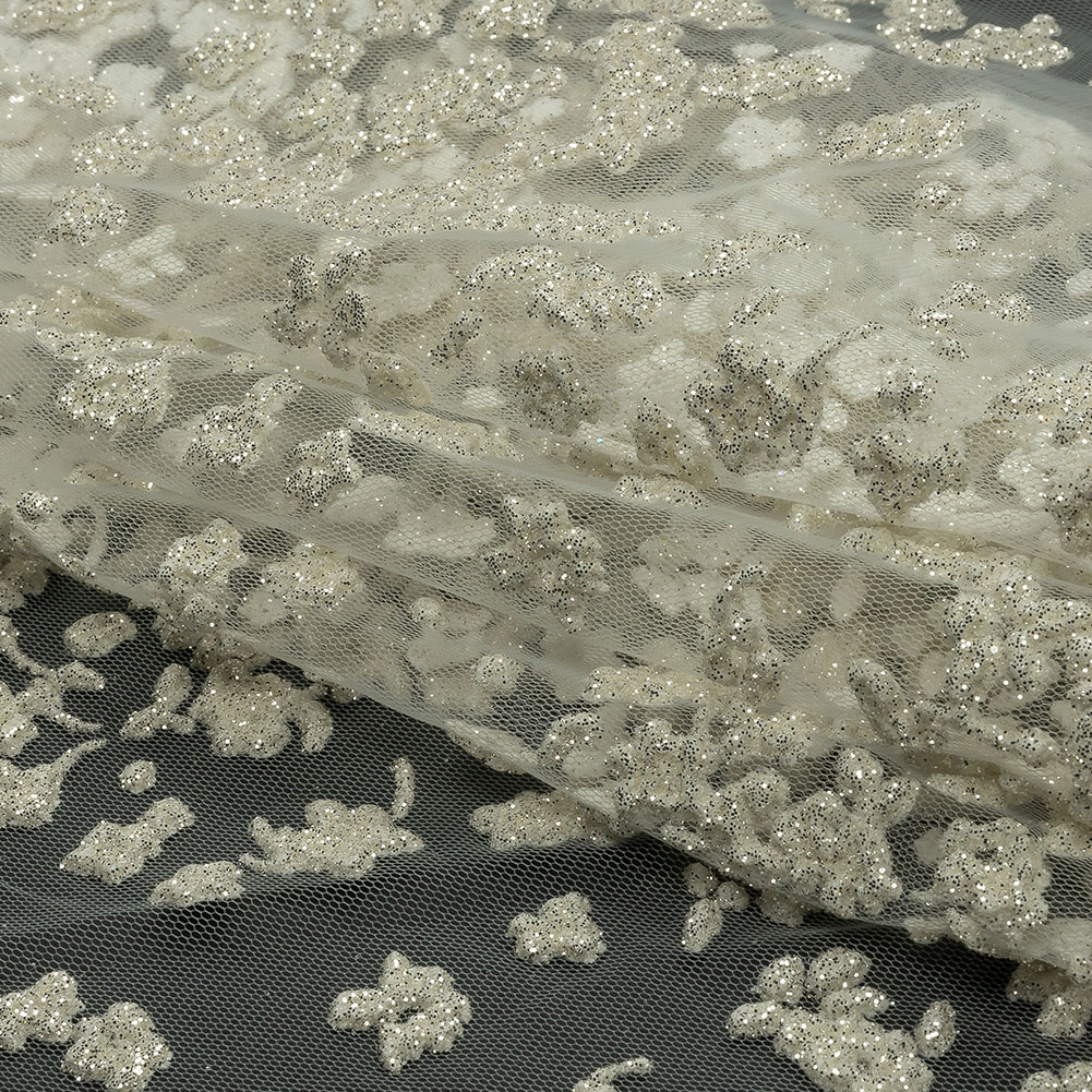 Whimsical, tiny white flowers made of sparkling snow appear on the runaway stage with this 3D White Floral Puffy Glitter Tulle.