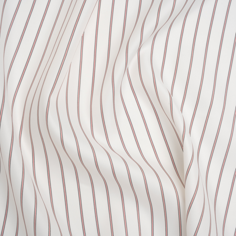Perfect your project to the very last detail with this Striped Acetate Twill Lining, featuring a sleek, cool hand and fluid drape—ideally paired with a fashion fabric for a fully opaque finish.Suggested Projects: Linings for Jackets, Blazers, Dresses, SkirtsContent: AcetateStretch: NoneOpacity: SheerDelicate black and red threads race across the white backdrop of this twill lining in crisp, tailored stripes. With a sleek, cool hand and fluid drape, it’s the ideal companion for any number of fashion fabrics, lending garments a polished, professional finish. Line everything from pea and trench coats to blazers, jackets, cloaks, and even dresses or skirts. Sheer and lightweight, this fabric is best layered with a fashion fabric for full opacity and structure.