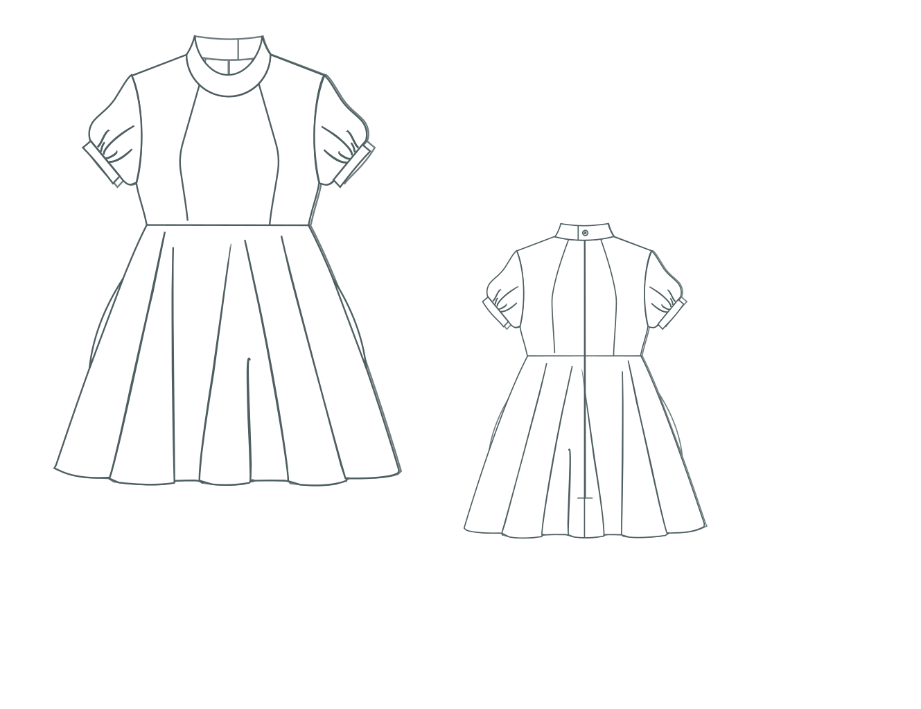 This is a PDF (8.5x11) pattern file. Woven, full circle mini dress with neckline princess seams; an Empire waist bodice; stand-up collar; round jewel neck at the front and back; back button closure; short bishop sleeves.