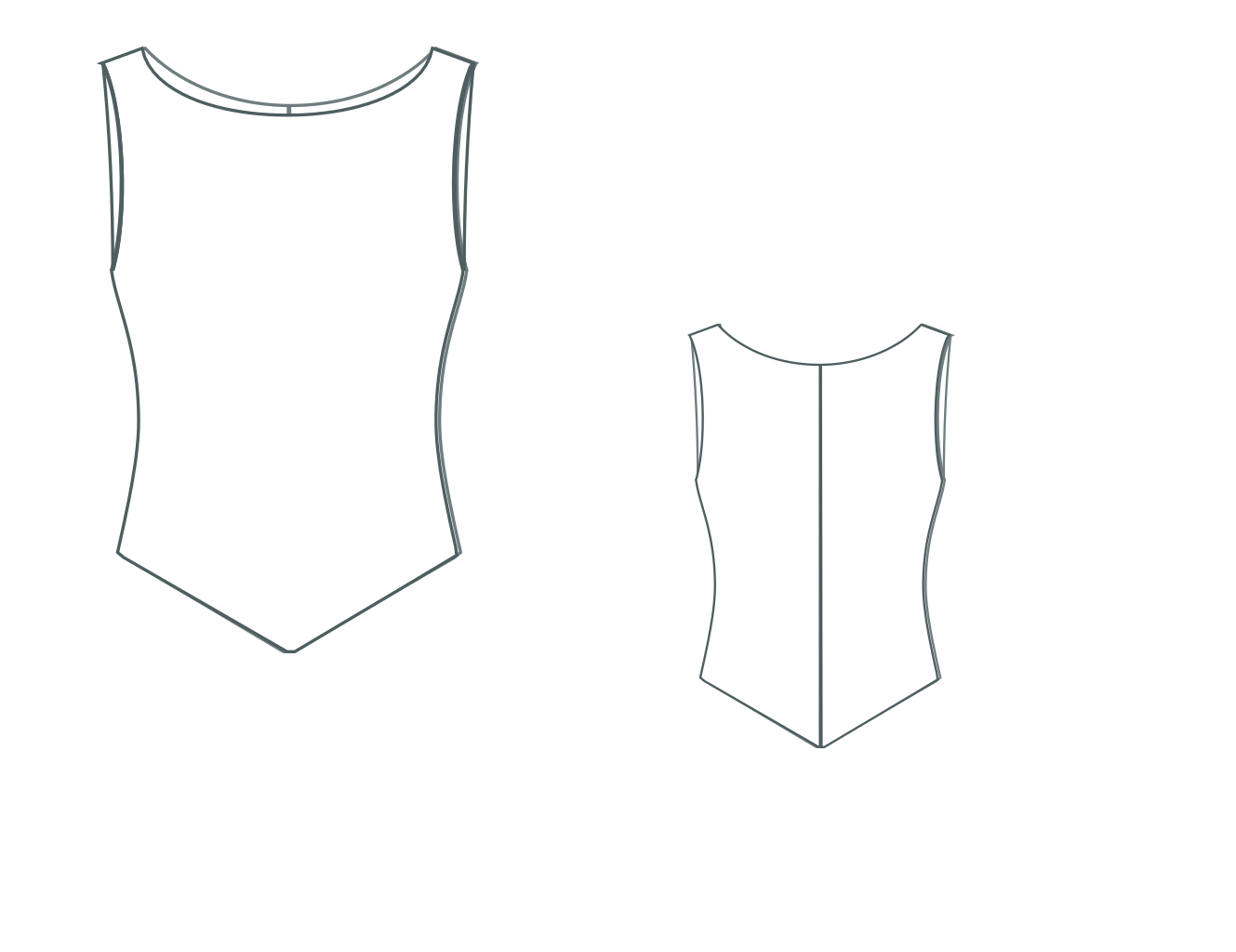 Knit, fitted, high hip top with a boat neck, deep scoop neck at the back, tapered hem, sleeveless.