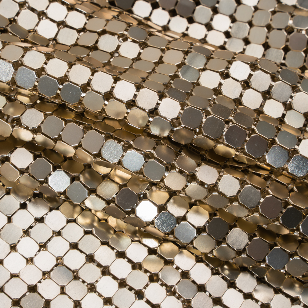 Blend ancient strength with modern flair with this Gold 8mm Tubular Aluminum Chainmail Fabric—featuring a fluid, slightly structured drape and cool, sleek hand.Suggested Projects: Dresses, Tops, Skirts, BagsContent: 100% AluminumStretch: NoneOpacity: SheerGuard your kingdom in style with this gold 8mm aluminum chainmail, the ultimate armor for the modern-day warrior. From the first chainmail dress in the 1960s to Paris Hilton’s iconic Y2K look, metallic chainmail fabrics have always made a bold statement—and now they're making a powerful comeback. Beloved by high-end designers and worn by red carpet stars, this fabric seamlessly combines opulence with an edgy, rebellious flair. With a cool, sleek hand and a slightly structured yet fluid drape, this chainmail is perfect for crafting couture dresses, avant-garde armor-inspired creations, statement bags, daring tops, and flirty mini-skirts. Wear it sheer for a daring look or add a slip for full opacity—either way, all eyes will be on you.As it’s a unique fabric, here’s some quick how-to-sew tips that’ll help ensure a seamless experience:Hand sew with invisible thread.Use small pliers to take the fabric apart/take pieces off.Please note that this fabric is sold as a tubular piece of chainmail. It is 15.75 inches long and measures about 29 inches wide when laid flat, for a total circumference of 59 inches.