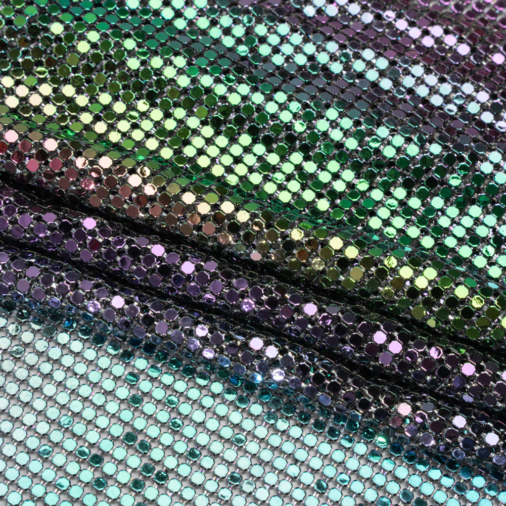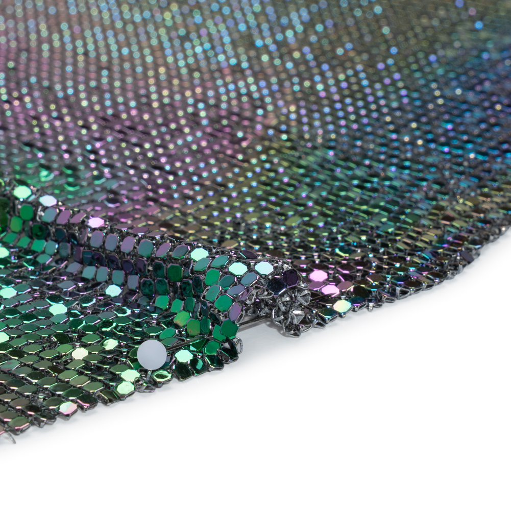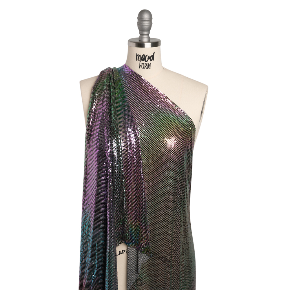 Glide through high profile events in this Rainbow Oil Slick 3mm Aluminum Chainmail Fabric Panel—featuring a fluid drape and cool, sleek hand.Suggested Projects: Dresses, Tops, Skirts, BagsContent: 100% AluminumStretch: NoneOpacity: SheerFrom the first chainmail dress of the 1960s to Paris Hilton’s iconic Y2K look, metallic chainmail fabrics have always made bold statements—and they’re back in full force! Beloved by high-end designers and worn by stars like Chappell Roan and Kylie Jenner, the water-like fluidity of this textile blends elegance with an edgy allure. Thin yet heavy in weight, it drapes beautifully for couture dresses, gowns, bags, tops, and mini skirts. Wear it sheer for a daring look or add a slip for added opacity—the spotlight is yours.As it’s a unique fabric, here’s some quick how-to-sew tips that’ll help ensure a seamless experience:Hand sew with invisible thread.Although chainmail can be cut with standard scissors, we don’t recommend it as it’ll dull the blades.Use small pliers to take the fabric apart/take pieces off.Please note that this fabric is sold as a panel measuring 17.5 inches by 59 inches.