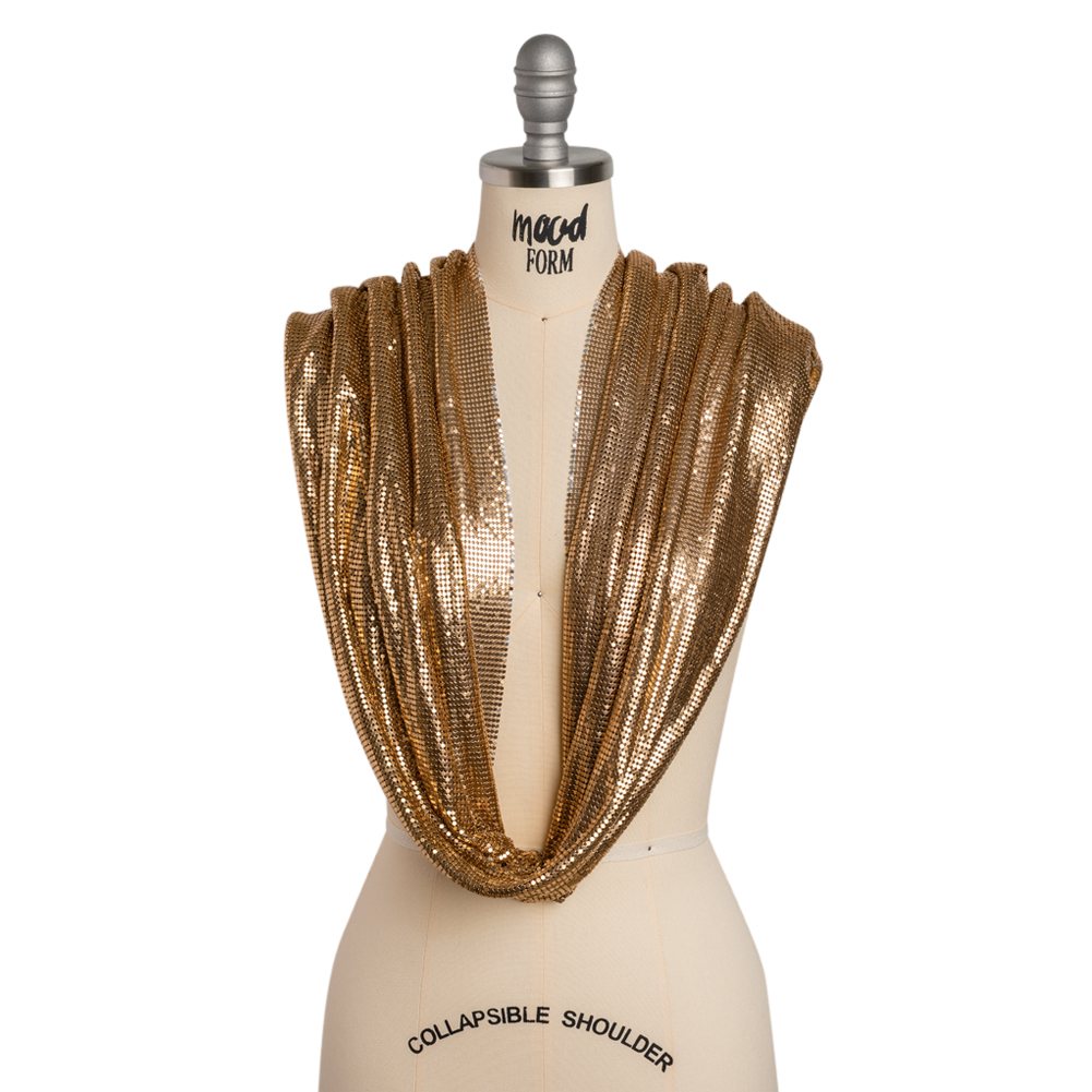Party alongside Gatsby in this Gilded Bronze 3mm Tubular Aluminum Chainmail Fabric Panel—featuring a fluid drape and cool, sleek hand.Suggested Projects: Dresses, Tops, Skirts, BagsContent: 100% AluminumStretch: NoneOpacity: SheerFrom the first chainmail dress of the 1960s to Paris Hilton’s iconic Y2K look, metallic chainmail fabrics have always made bold statements—and they’re back in full force! Beloved by high-end designers and worn by stars like Chappell Roan and Kylie Jenner, the water-like fluidity of this textile blends elegance with an edgy allure. Thin yet heavy in weight, it drapes beautifully for couture dresses, gowns, bags, tops, and mini skirts. Wear it sheer for a daring look or add a slip for added opacity—the spotlight is yours.Here are some quick sewing tips to ensure a smooth and seamless experience:Hand sew with invisible thread.Although chainmail can be cut with standard scissors, we don’t recommend it as it’ll dull the blades.Use small pliers to take the fabric apart/take pieces off.Please note that this fabric is sold as a tubular piece of chainmail. It is 17.5 inches long and measures about 29 inches wide when laid flat, for a total circumference of 59 inches.