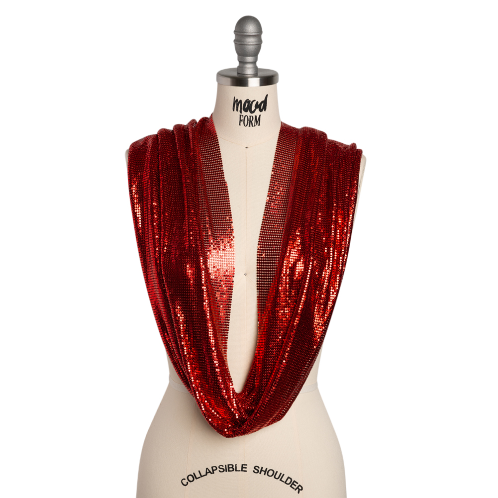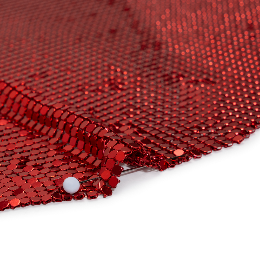 Doors will always open—no red tape in sight—when you wear this Red 3mm Tubular Aluminum Chainmail Fabric Panel, featuring a fluid drape and cool, sleek hand.Suggested Projects: Dresses, Tops, Skirts, BagsContent: 100% AluminumStretch: NoneOpacity: SheerFrom the first chainmail dress of the 1960s to Paris Hilton’s iconic Y2K look, metallic chainmail fabrics have always made bold statements—and they’re back in full force! Beloved by high-end designers and worn by stars like Chappell Roan and Kylie Jenner, the water-like fluidity of this textile blends elegance with an edgy allure. Thin yet heavy in weight, it drapes beautifully for couture dresses, gowns, bags, tops, and mini skirts. Wear it sheer for a daring look or add a slip for added opacity—the spotlight is yours.As it’s a unique fabric, here’s some quick how-to-sew tips that’ll help ensure a seamless experience:Hand sew with invisible thread.Although chainmail can be cut with standard scissors, we don’t recommend it as it’ll dull the blades.Use small pliers to take the fabric apart/take pieces off.Please note that this fabric is sold as a tubular piece of chainmail. It is 17.5 inches long and measures about 29 inches wide when laid flat, for a total circumference of 59 inches.