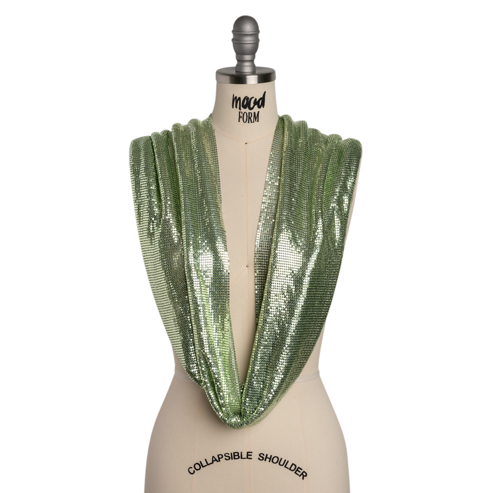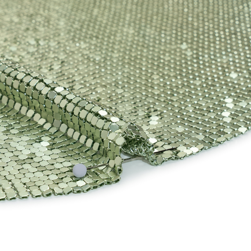 This Sage Green 3mm Tubular Aluminum Chainmail Fabric Panel is alive with forest fairy magic—featuring a fluid drape and cool, sleek hand.Suggested Projects: Dresses, Tops, Skirts, BagsContent: 100% AluminumStretch: NoneOpacity: SheerFrom the first chainmail dress of the 1960s to Paris Hilton’s iconic Y2K look, metallic chainmail fabrics have always made bold statements—and they’re back in full force! Beloved by high-end designers and worn by stars like Chappell Roan and Kylie Jenner, the water-like fluidity of this textile blends elegance with an edgy allure. Thin yet heavy in weight, it drapes beautifully for couture dresses, gowns, bags, tops, and mini skirts. Wear it sheer for a daring look or add a slip for added opacity—the spotlight is yours.As it’s a unique fabric, here’s some quick how-to-sew tips that’ll help ensure a seamless experience:Hand sew with invisible thread.Although chainmail can be cut with standard scissors, we don’t recommend it as it’ll dull the blades.Use small pliers to take the fabric apart/take pieces off.Please note that this fabric is sold as a tubular piece of chainmail. It is 17.5 inches long and measures about 29 inches wide when laid flat, for a total circumference of 59 inches.