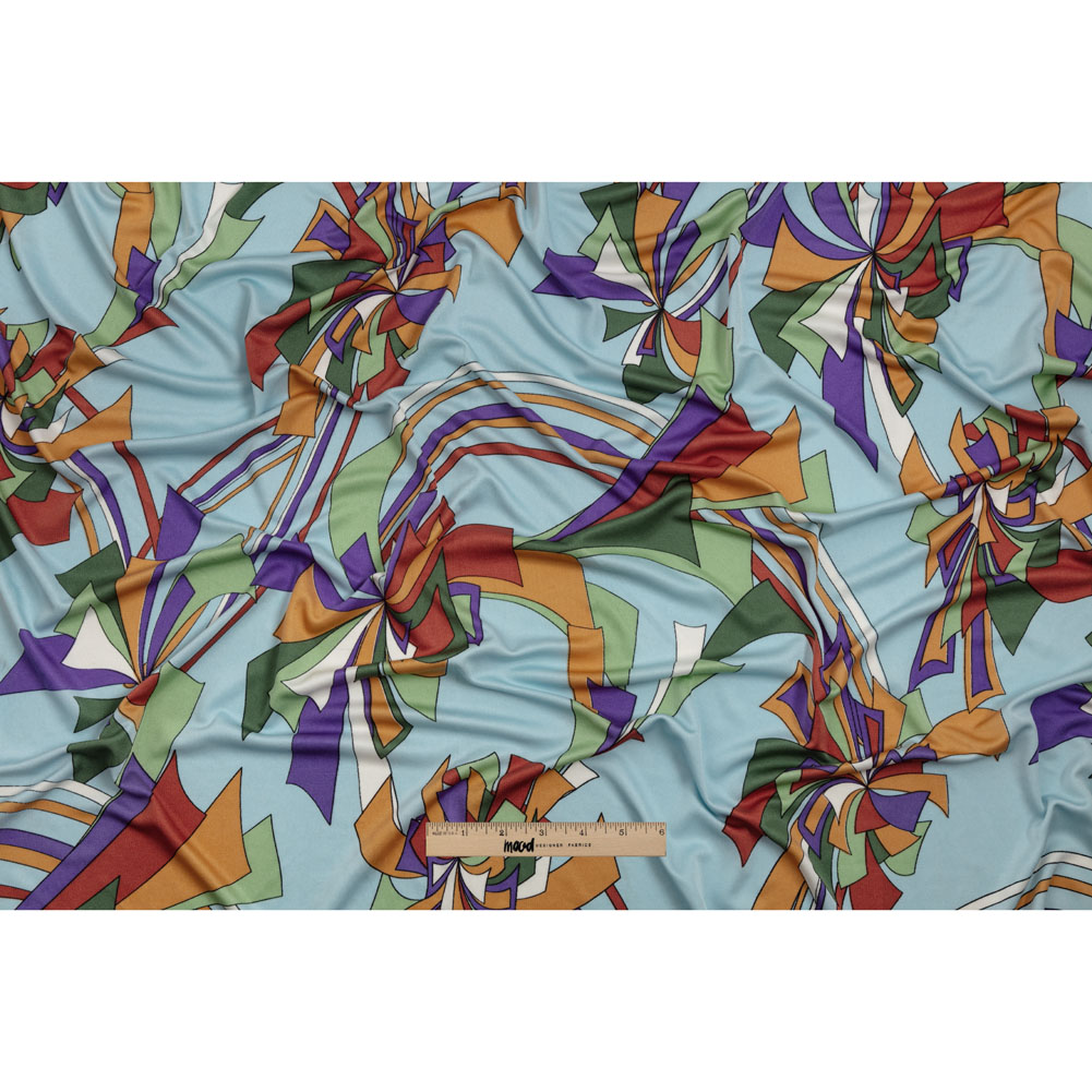 Oh, the places this Aqua, Purple and Green Geometric Explosions Silk Jersey will go! Fondly reminiscent of the zany world of Dr. Seuss, purple, orange, and green explosions wizz across a pale blue sky, busting with glee and shining lustrously in the light.
