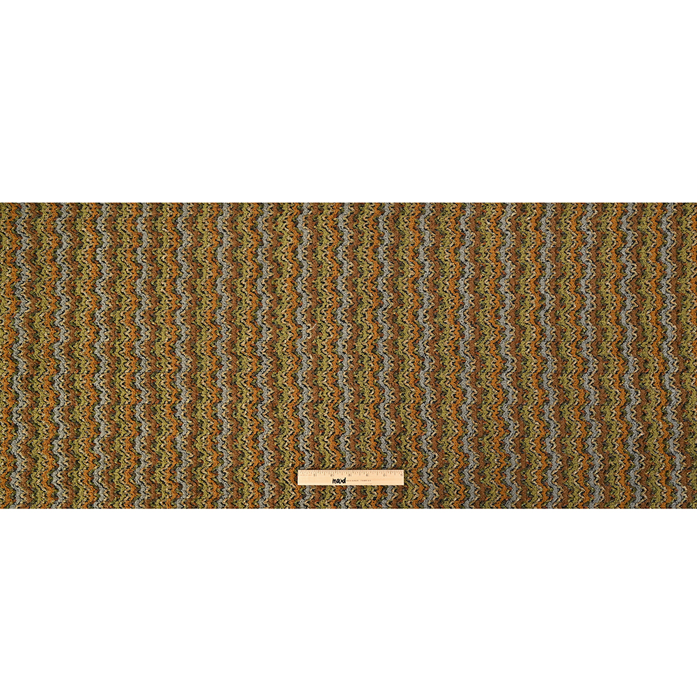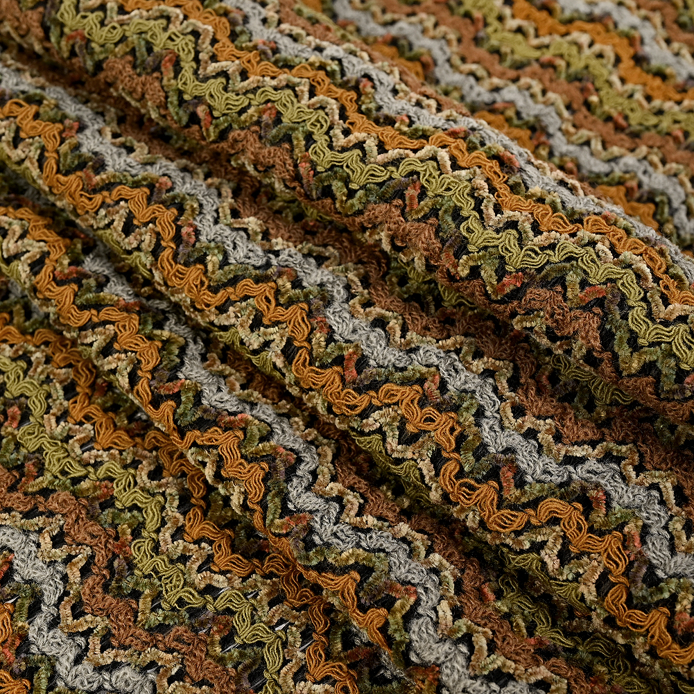 Mood's Novelty Avocado, Mustard and Steel Blue Textural Woven boasts a superb array of rustic hues zig-zagging throughout. Extremely soft in hand, its unique combination of chenille yarns and acrylic threads are braided in every which direction to set this novelty woven apart. Light to medium weight and without stretch, its delightfully plush texture complements its matte complexion. To make the most out of its flexible, dreamlike drape, create comfy crewneck sweaters, vests, or any boho style application. Semi-sheer due to the looser weave, a lining may be desired for increased opacity depending on its application.