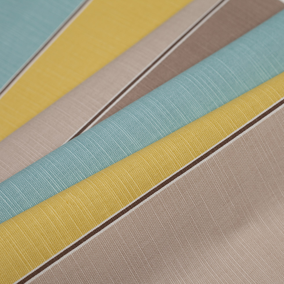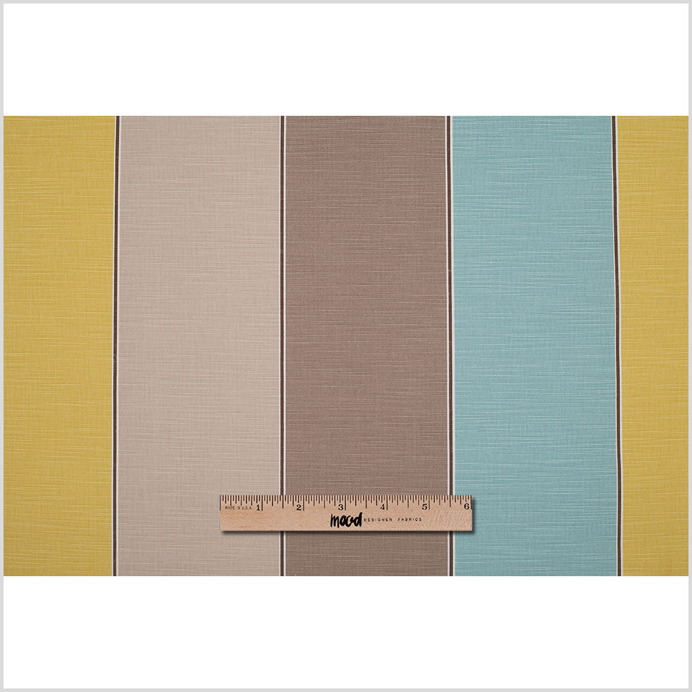 From England, cotton woven home decor fabric featuring wide, colorful stripes.