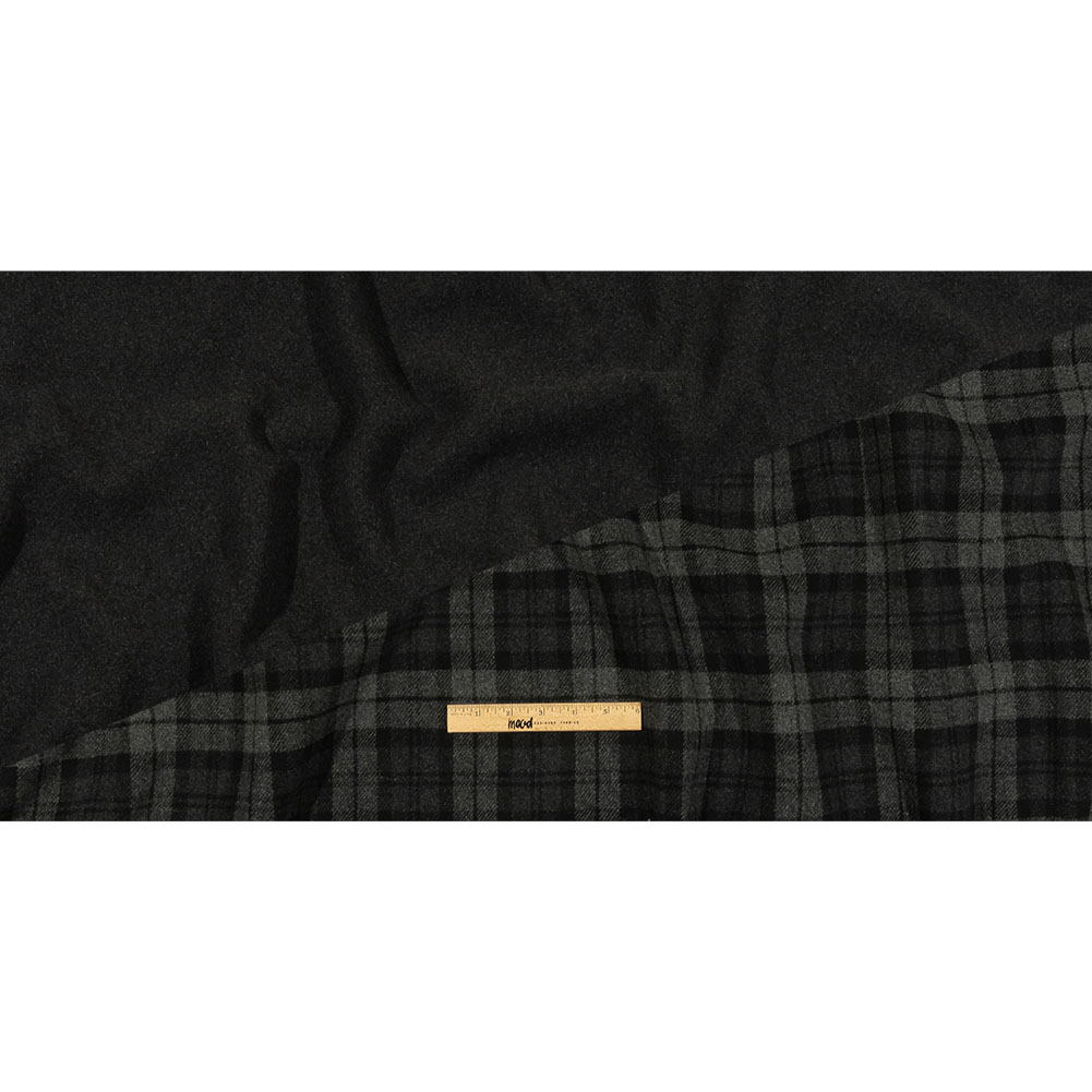 Bring out a romantic, yet edgy side with this Italian Black and Raven Tartan Cashmere and Wool Blend Double Cloth Coating, courtesy of Balenciaga! Composed of two fabrics stitched or fused together, double cloth is fully reversible, heavyweight, and structural. In this instance, both sides are fuzzy and soft in feel, with the face displaying a black and charcoal tartan, and the other a simplistic mottled charcoal finish. Craft a variety of winter coats perfect for keeping you warm, including oversized coats with large collars, trench coats, or princess-seamed confections. Opaque, a lining may be desired for a professional finish, if this fabric is not used in a reversible design.