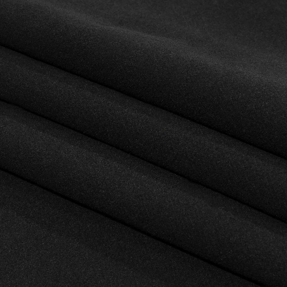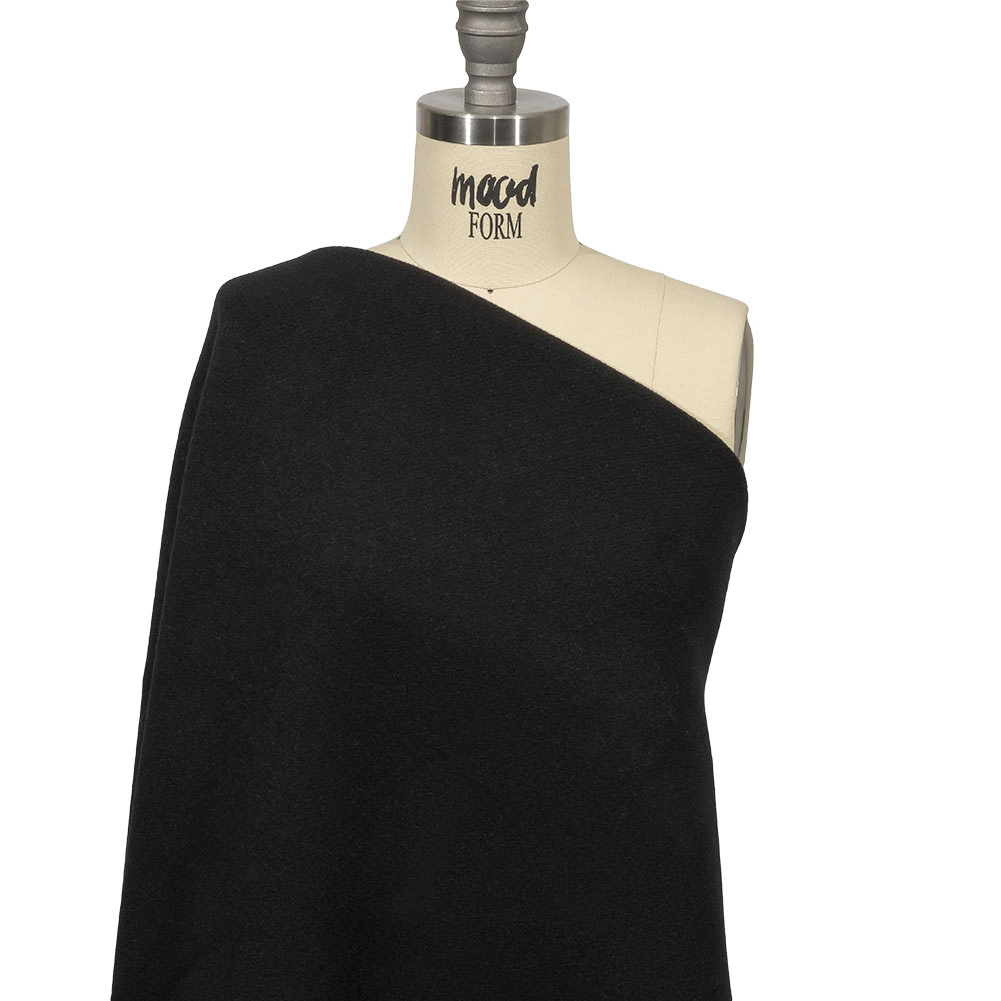 Wrap yourself in the coziest of luxury coatings with this Italian Black Brushed Camel Hair Double Cloth Twill Coating, courtesy of Balenciaga! Exceptionally soft and fuzzy in hand with just a touch of sponginess, this double cloth coating features two layers of black brushed twill fabric held together white basting stitches (but don't worry—you can't see the white on the outside of the material). With a structural but still malleable drape and a slight weftwise mechanical give, create sleek pea coats, elegant cape coats, or cocoon coats warm enough to make a caterpillar jealous. Opaque, a lining isn't necessary but may be desired for a polished finish, particularly in tailored applications.