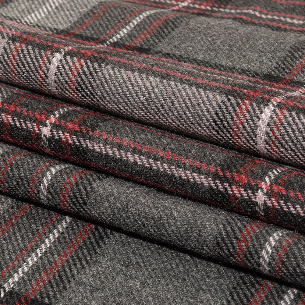Make outerwear that stands out amongst a sea of black coats with this Italian Gray, Biking Red and Violet Ice Plaid Wool Twill by Balenciaga! A large, intricate plaid is formed with pink, berry red, and gray shades. Tactile with a fuzzy, woolen feel and pliable, semi-structured drape, classic coats, including trenches, Chesterfields, and princess-seamed coats, are a must. Though opaque, a lining may be desired for tailoring and comfortability purposes.