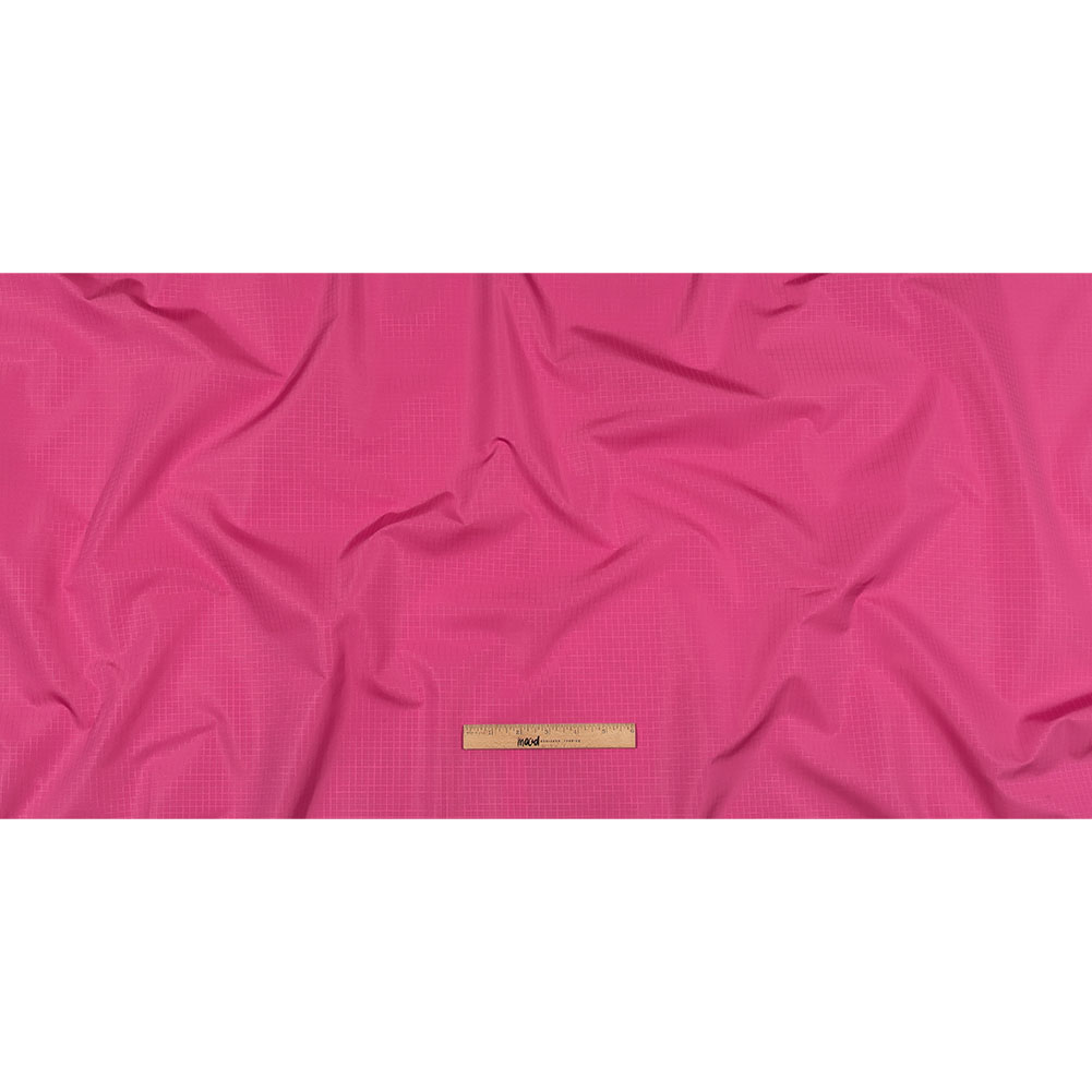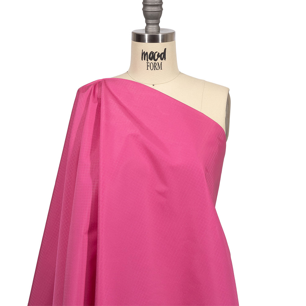 Between sweet and sassy, there you'll find this trendy Italian Hot Pink Polyester Ripstop by Balenciaga! On the face, a satin-like sheen and smooth feel are enhanced by a tonal, hot pink square weave. The backing is slightly gummy in feel, thanks to the ripstop weave and treatment that increases durability and tear resistance. Fluid and malleable in drape with an audible swish, create performance jackets, including windbreakers and trenches, or durable accessories and luggage linings. Opaque, a lining is not necessary for most projects.