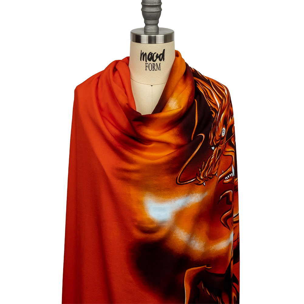 Wear this Balenciaga Italian Orange and Black Dragon and Smoke Stretch Cotton Jersey with the confidence of a dragon! Inspired by graffiti and street art, a large orange and black dragon breathes fire over a bright orange ground. With a 75% all-way stretch and supple drape, design day dresses, loungewear, leggings, t-shirts, and more. Nearly opaque until stretched, a lining is required for most applications. Please note: This fabric is sold by the panel, with each panel measuring 48 inches long by 56 inches wide.