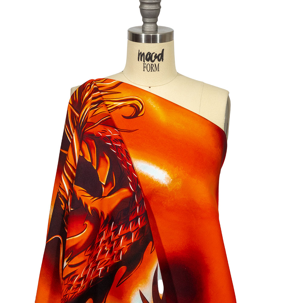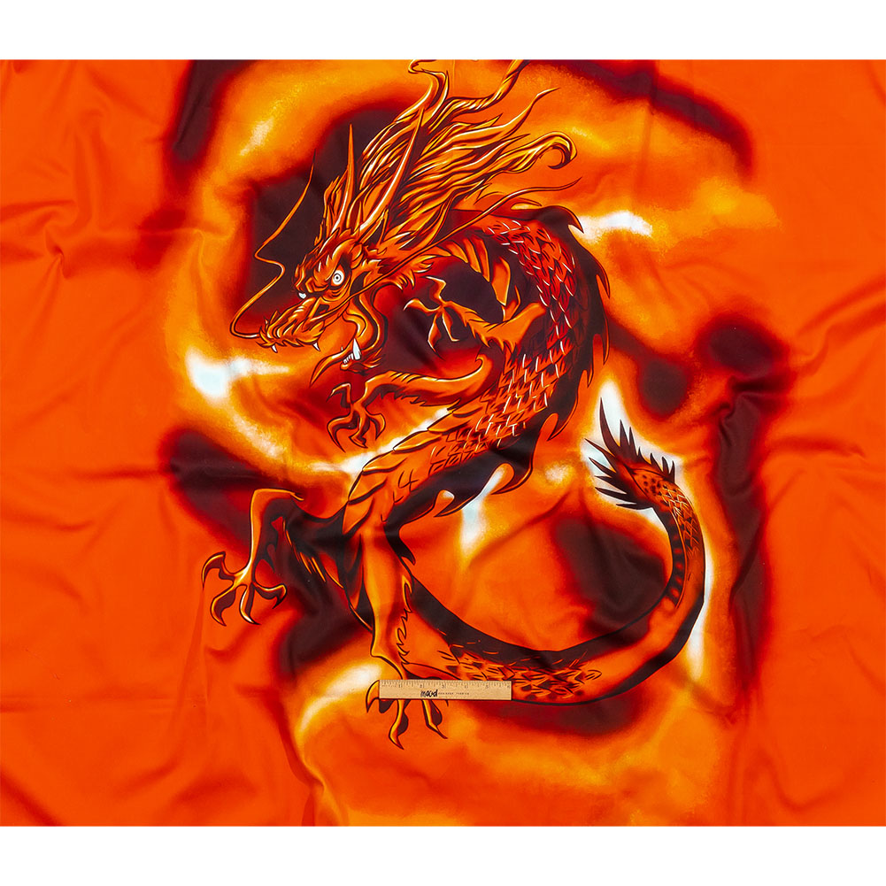 Take style cues from 1980’s hip-hop icons in this Italian Orange and Black Dragon and Smoke Stretch Cotton Twill Panel by Balenciaga! Inspired by graffiti and other street art, a large orange and black dragon breathes fire over a bright orange ground.