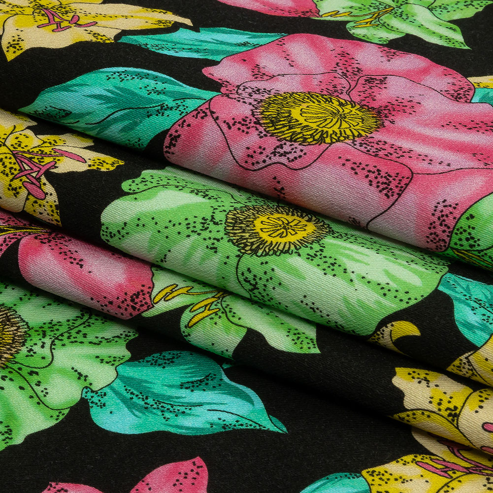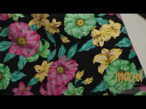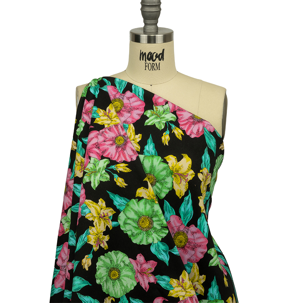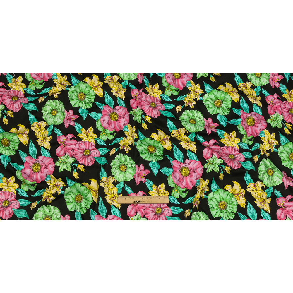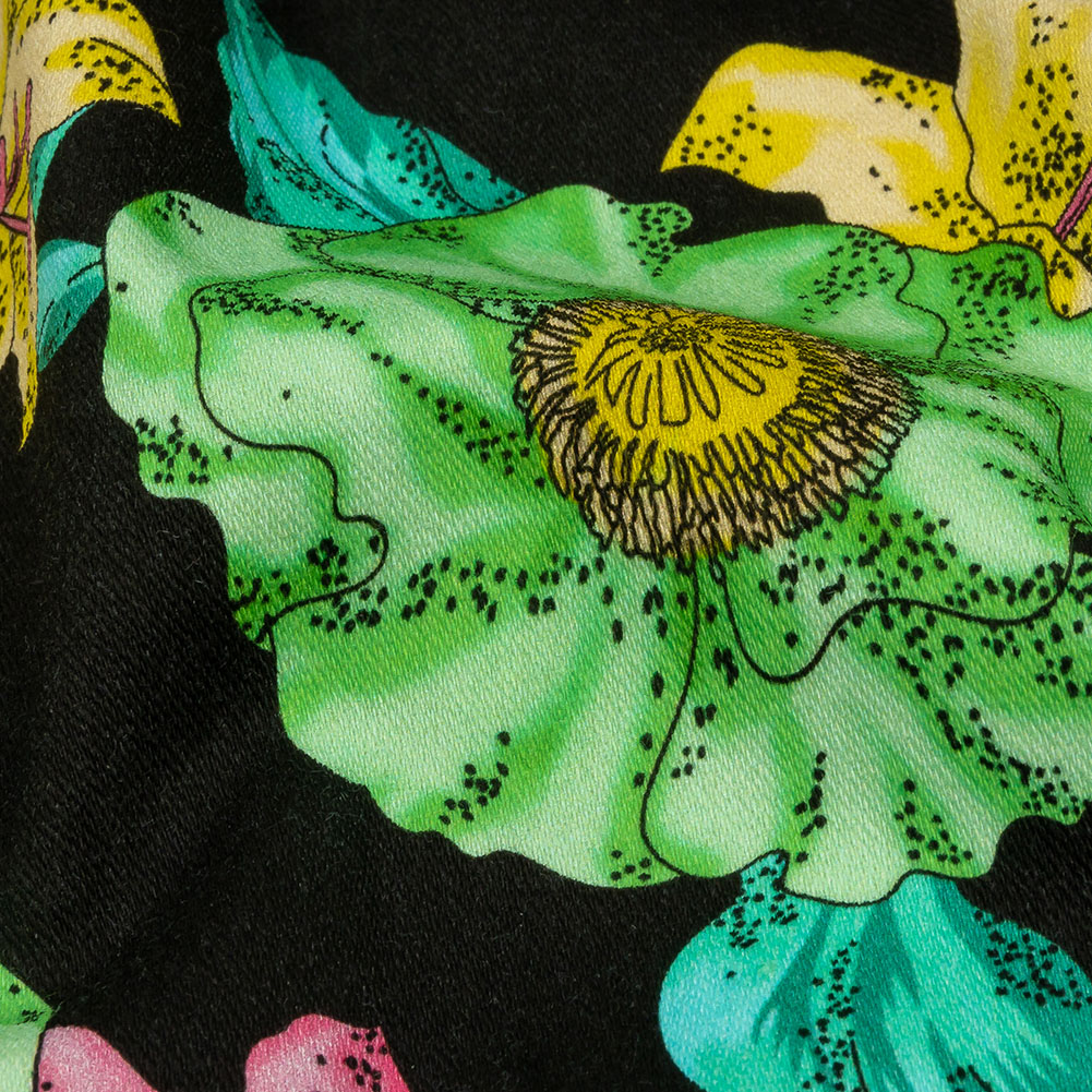 This Balenciaga Italian Pink, Yellow and Lime Floral Stretch Cotton Twill will make you feel vacation ready! Displaying a black base that allows its pink, yellow, and lime tropical florals to pop, this twill provides a crisp hand and a 25% weftwise stretch.