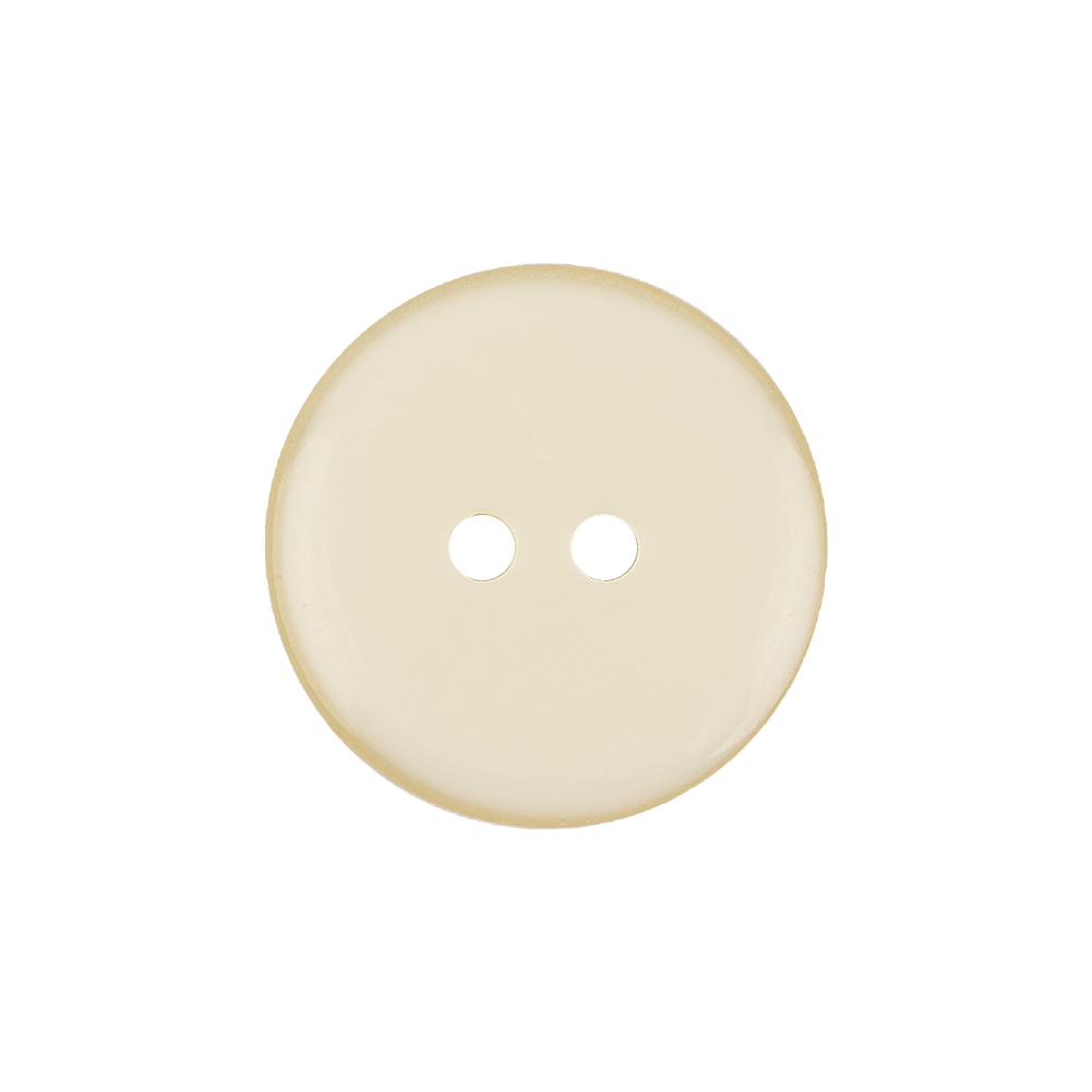 Mood carries an expansive array of plastic buttons in all shapes, sizes, and colors! Here, in particular, we have a round Barely Yellow Tinted Abstract 2-Hole Button with Saw Toothed Etchings featuring a slightly concave design overall with a pastel yellow sheen and etched markings around the rim, with a matte white backing.