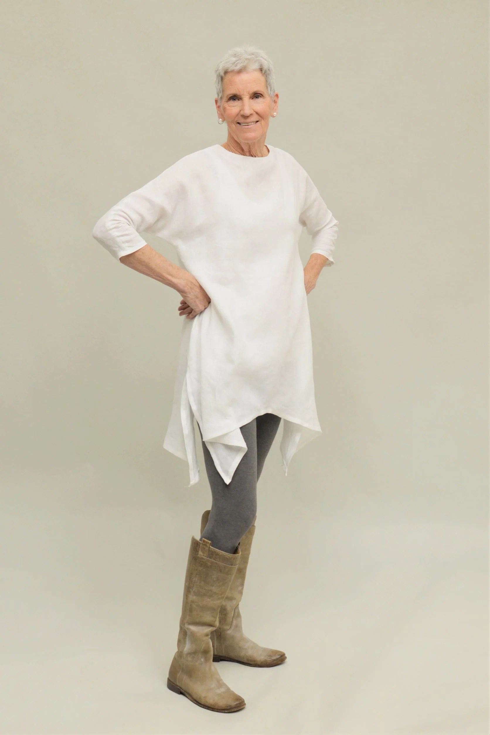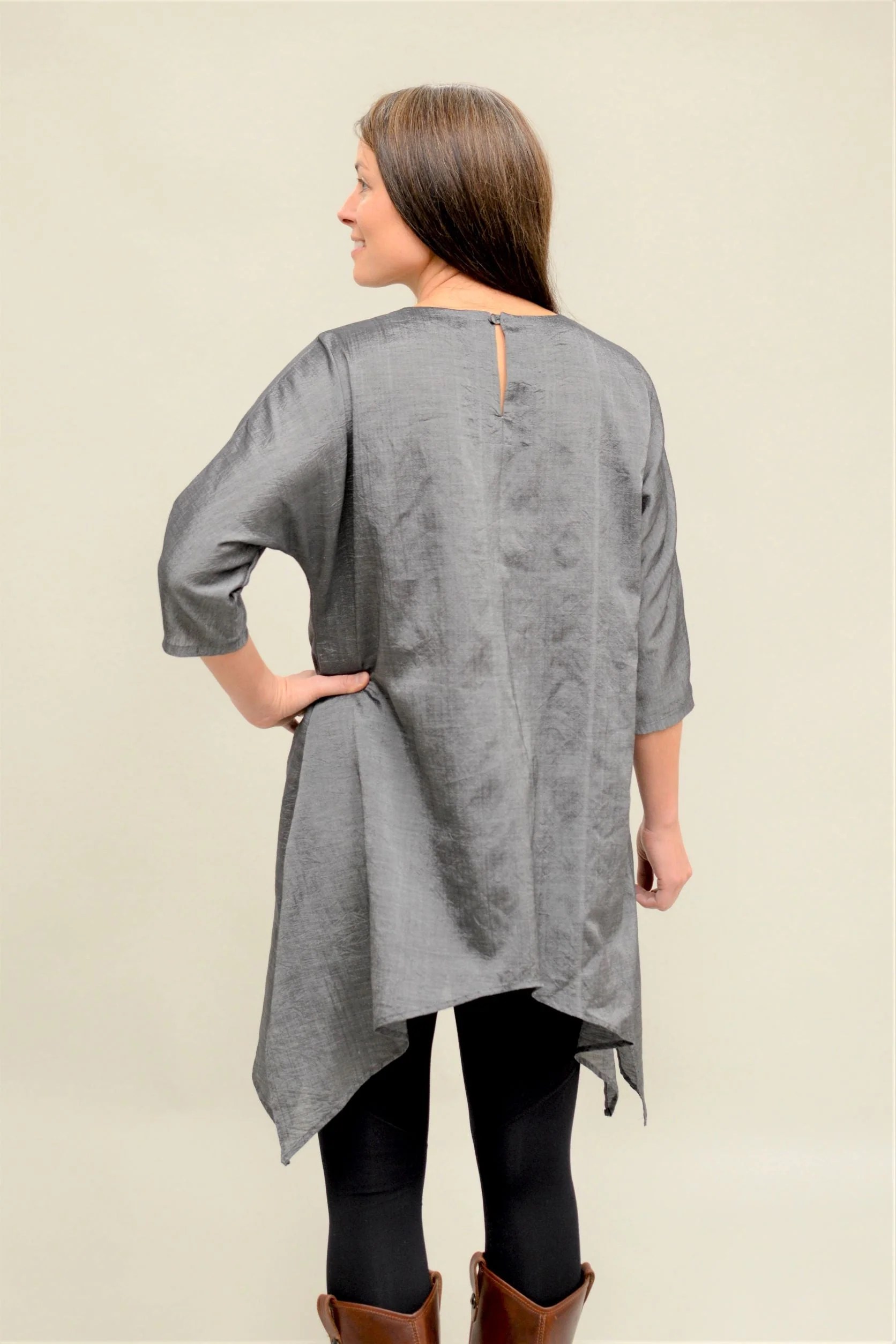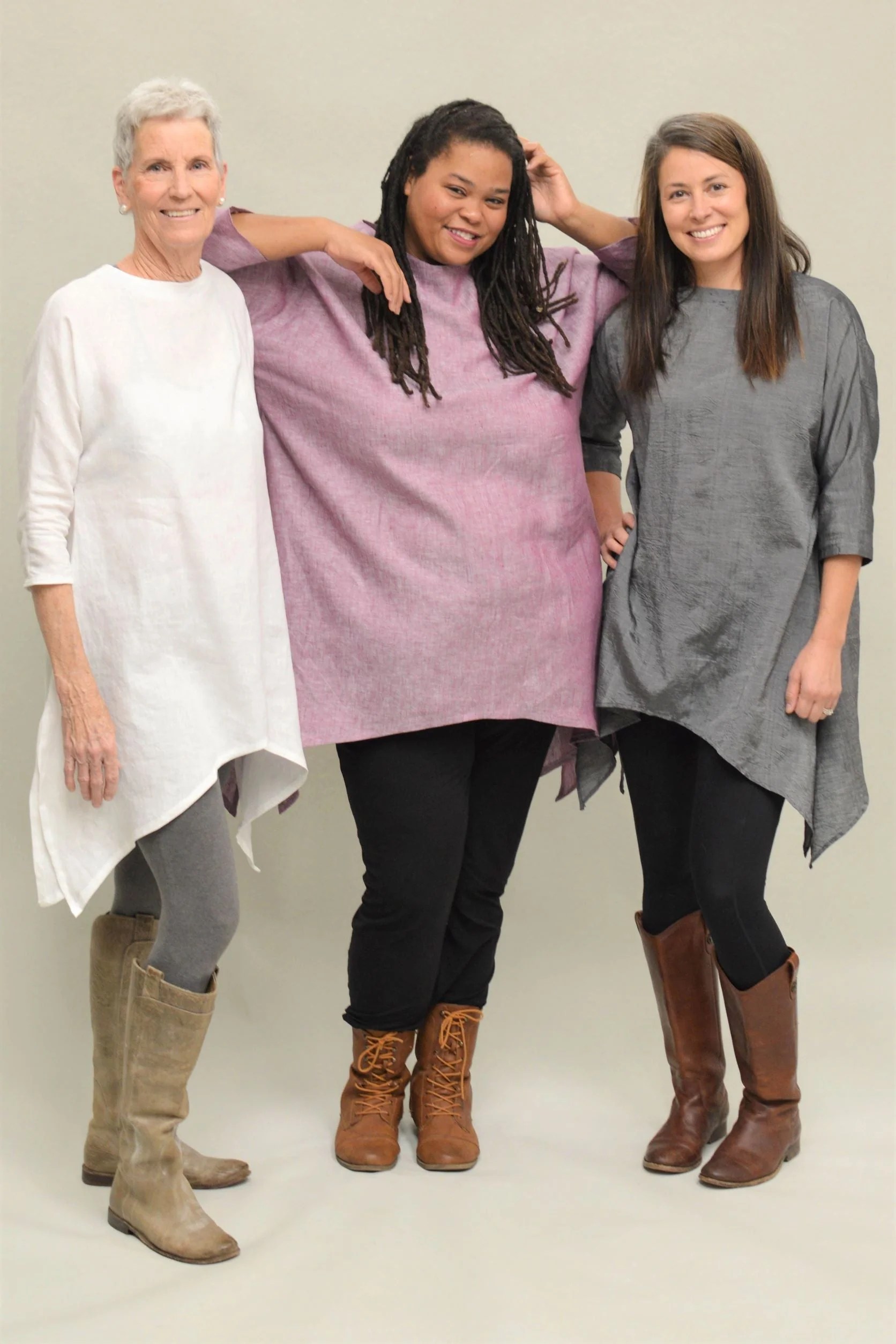 This easy-sew simple tunic pattern features a handkerchief hem, side vents, and dolman, three-quarter length sleeves. The fit is roomy and loose, making a comfortable and stylish piece to wear over leggings or jeans. The high neckline is closed in the back with a hook-and-eye at the slit.  Gorgeous in silk for a dressy look or perfect in a rumpled linen, this tunic can be an everyday piece to wear again and again.