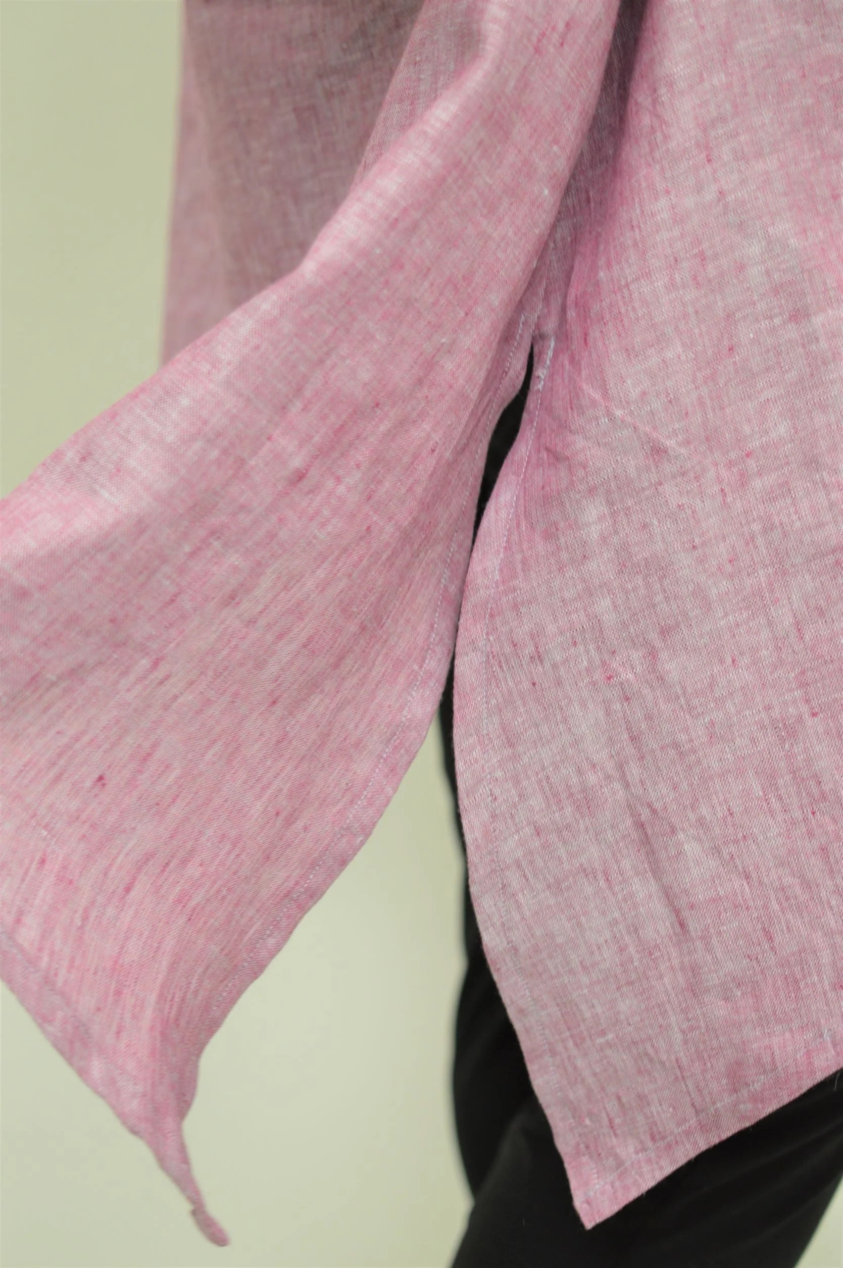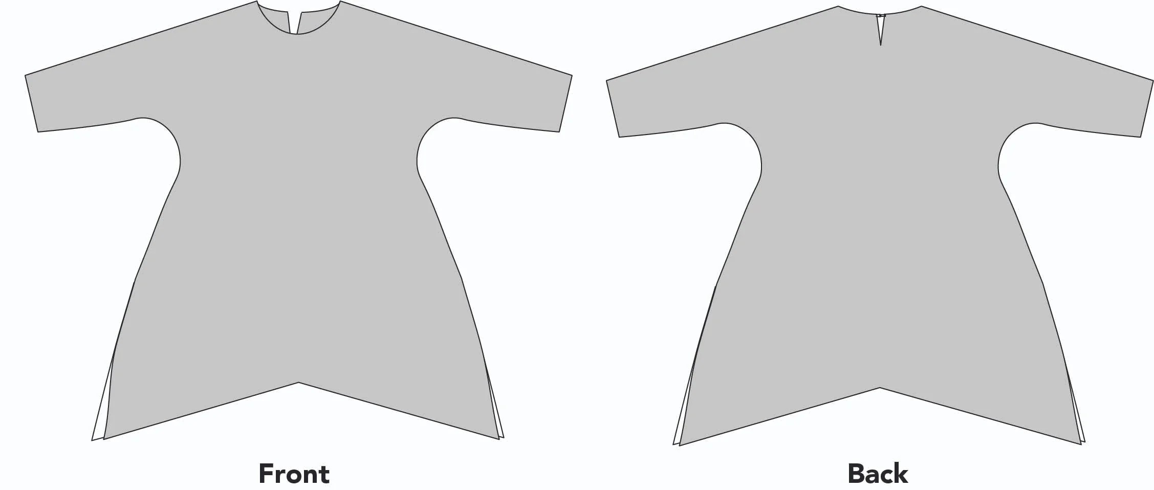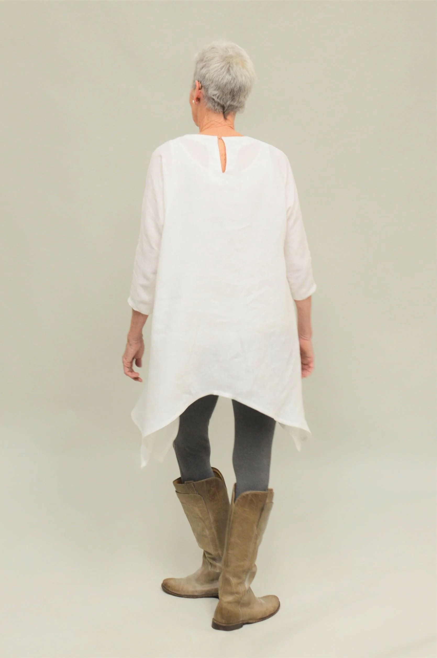 This easy-sew simple tunic pattern features a handkerchief hem, side vents, and dolman, three-quarter length sleeves. The fit is roomy and loose, making a comfortable and stylish piece to wear over leggings or jeans. The high neckline is closed in the back with a hook-and-eye at the slit.  Gorgeous in silk for a dressy look or perfect in a rumpled linen, this tunic can be an everyday piece to wear again and again.