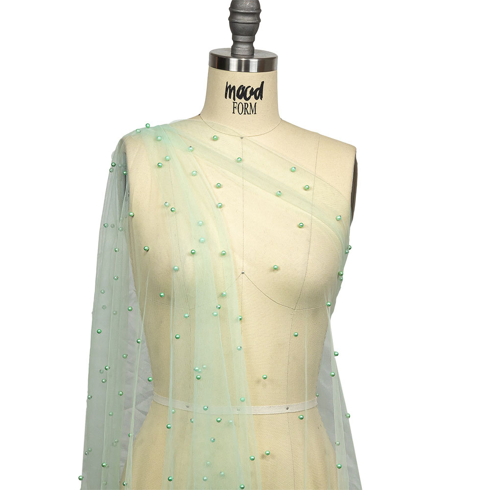 You'll look cool as a cucumber in this minty Aqua Beaded Tulle! Featuring a fluid drape and a soft, tactile hand.Suggested Projects: Veils, Necklines, Overlays for Dresses, AccessoriesContent: 100% NylonStretch: Slight Mechanical GiveOpacity: SheerLight blue-green pearl-like beads evenly dot a tulle backing of the same color. A fluid drape paired with a soft and lightly textured hand makes it ideal for accessories, veils, dress overlays, and decorated illusion necklines! Upgraded tutus are also an option. Sheer in construction, a lining is recommended for where opacity is desired.