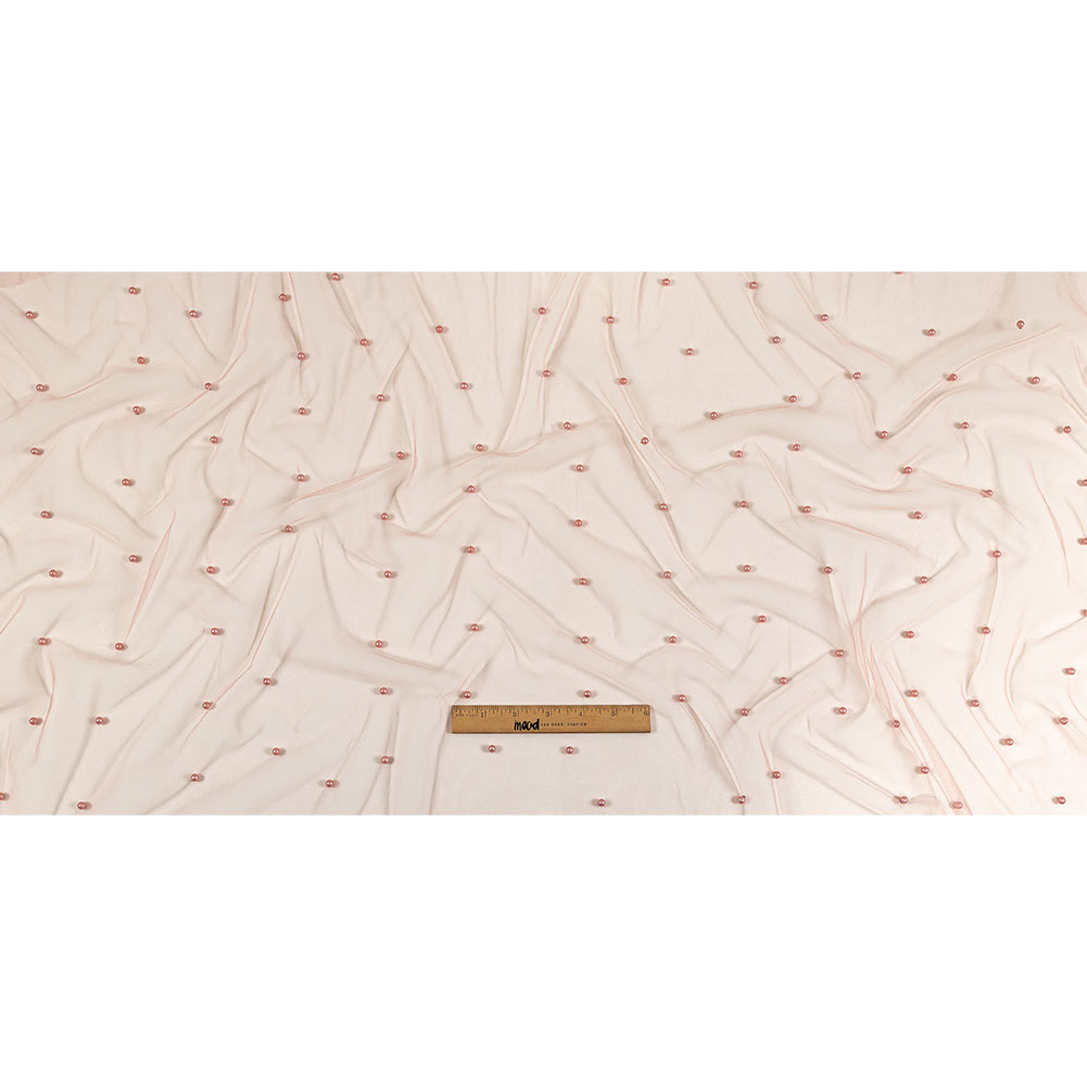 Soft, sweet, and undeniably luxe, this Coral Haze Beaded Tulle is a necessary addition to your next special occasion project. Featuring a fluid drape and a soft, tactile hand.Suggested Projects: Veils, Necklines, Overlays for Dresses, AccessoriesContent: 100% NylonStretch: Slight Mechanical GiveOpacity: SheerSoft pink pearl-like beads evenly dot a tulle backing of the same color. A fluid drape paired with a soft and lightly textured hand makes it ideal for accessories, veils, dress overlays, and decorated illusion necklines! Upgraded tutus are also an option. Sheer in construction, a lining is recommended for where opacity is desired.