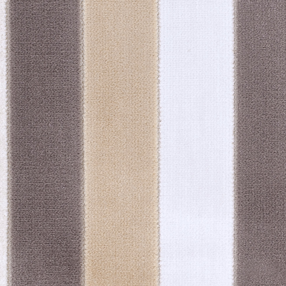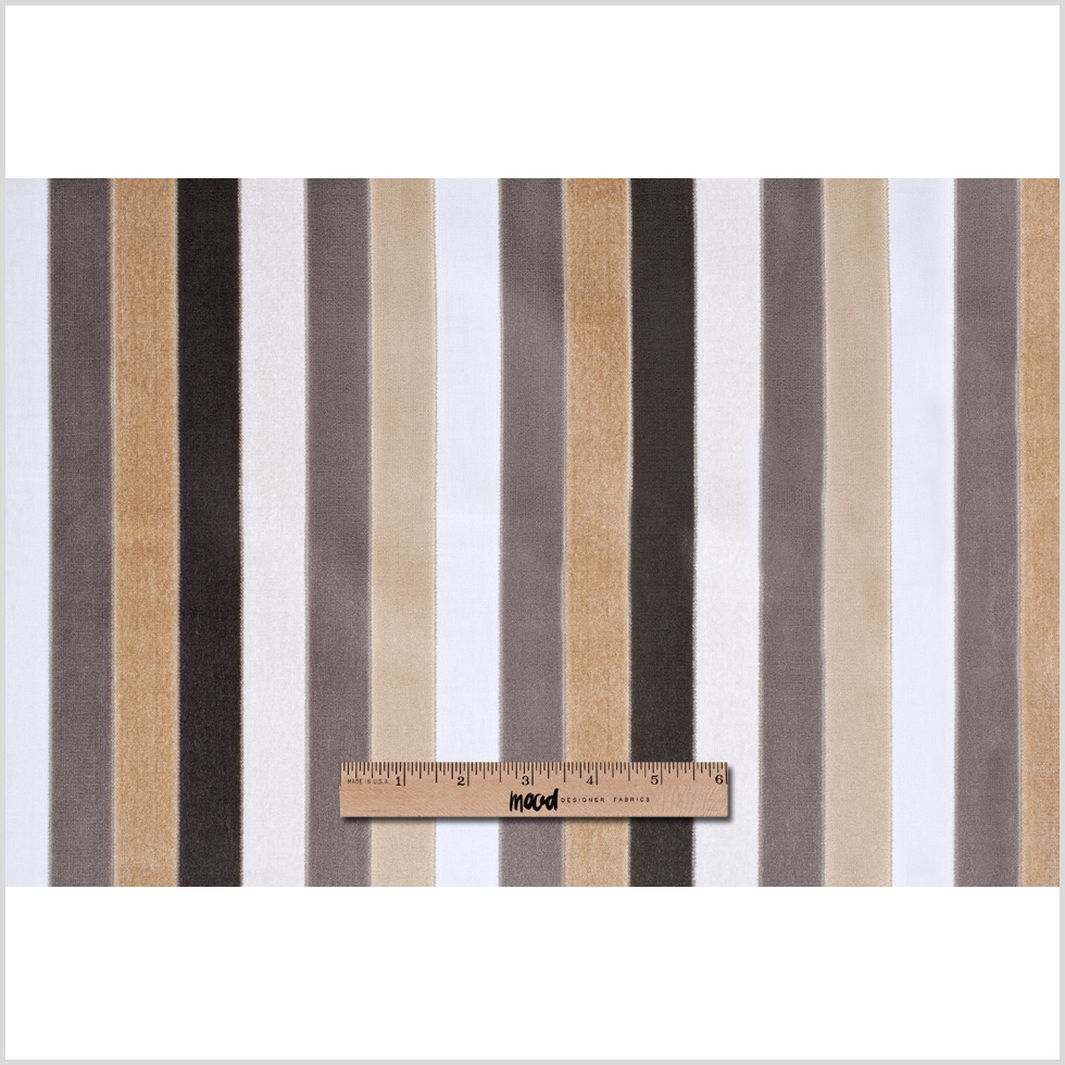 One-inch wide stripes in shades of beige and gray. Elegant cotton velvet home decor fabric.