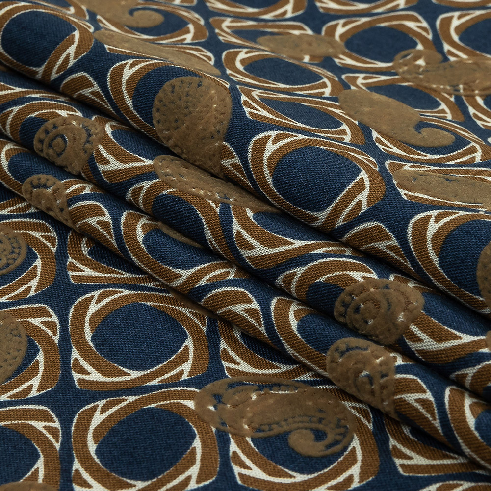 Beige and Navy Flocked Paisley on Twisted Squares Printed Viscose Woven