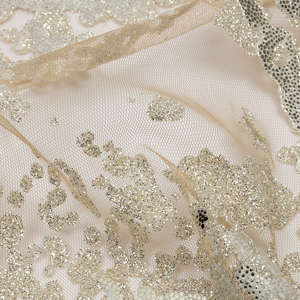 Be as mesmerizing as the milky way with this groovy Beige and Silver Abstract Glitter Tulle! Composed of a beige-toned backdrop, the intricate and complex design consists of mirrored dots that sit atop tiny bead-like droplets, themselves sitting over abstractly spotted sections of silver-white glitter. Created with a coarse texture due to its many embellishments, the material offers a mechanical give and a heavy, malleable drape.Light up the night by creating a decorative dress, ball gown or a skirt! Somewhat see-through, we suggest adding a lining for complete opacity.