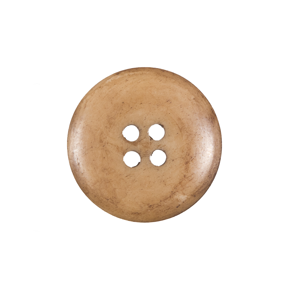 Mood has an eclectic collection of buttons to take your project to the next level. Here we have a round horn button featuring four centered holes on a recessed center surrounded by a raised rim within a raised rim. This specific button is available in sizes 20mm, 21.5mm, and 23mm. Mood has invested in a wide variety of horn buttons in all sorts of shapes, patterns, and sizes. Great for adding interest to any article of outerwear or accessory, and the best part is that no two horn buttons are identical!