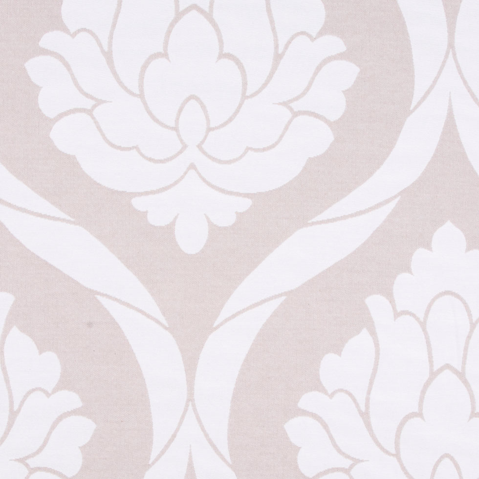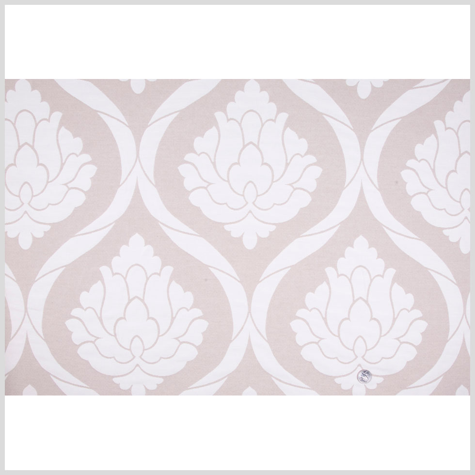 This is a woven cotton/poly blend in beige and natural with a large damask pattern.