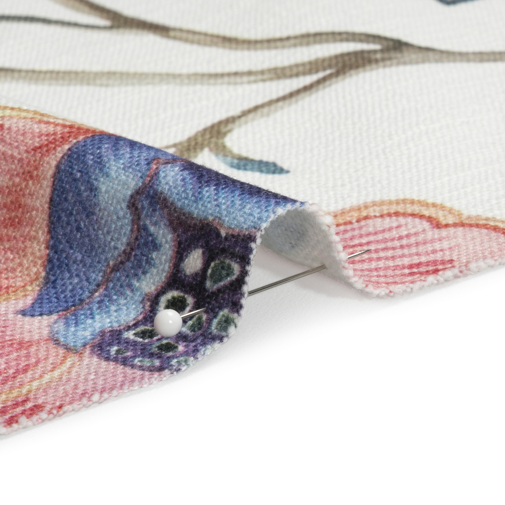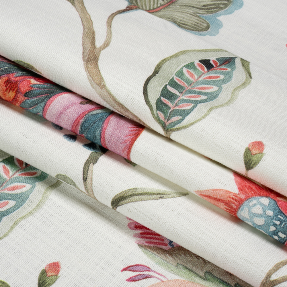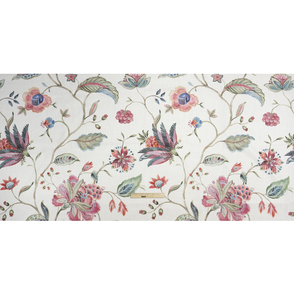 Plant an elegant garden in your home with this Berry, White and Teal Floral Slubbed Cotton Woven! Blooming from a long, brown stem, large pink, green, and blue flowers grow in watercolor hues against a white background. The 100% cotton content creates a soft yet slubbed hand and a malleable drape. Enjoy upholstering sofa cushions, accent armchairs, matching ottomans, and more! Plus, experiment with elegant curtains and valances, as well! Depending on the application, a lining may be desired to increase opacity.