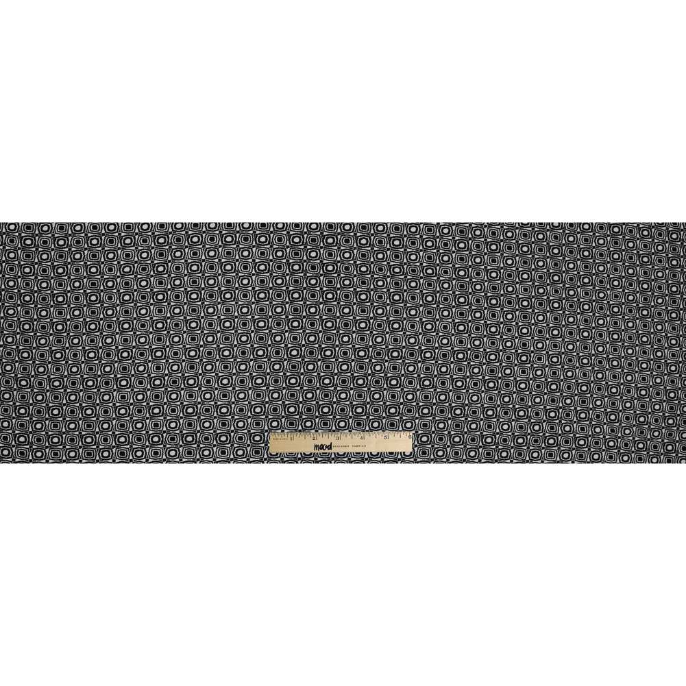 Take it back to the 60's mod trend with this Black and Ivory Geometric Polyester Crepe. Black and ivory creates a mesmerizing bullseye square pattern across the grainy textured crepe. Thin and of a medium weight, it has a fluid drape that excels in creating soft silhouettes. Add shift dresses, wide-leg pants and flowing tops to your spring, summer and fall wardrobes. Translucent, insert a lining for more opacity.