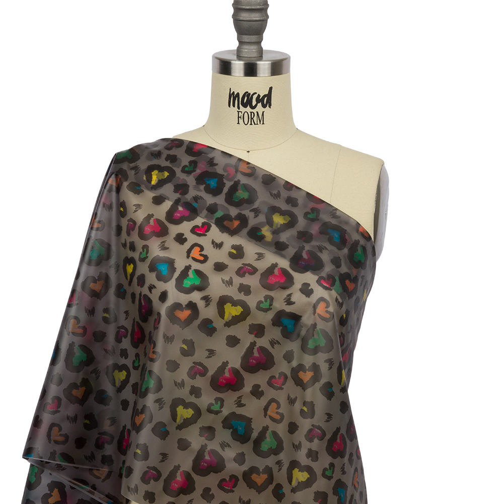 You'll find your inner child within this Black and Rainbow Animal Spot Hearts Lightweight Translucent Vinyl. Mimicking leopard spots, heavy black outlines form painterly heart shapes with a rainbow of bright colors in their centers, all atop a translucent gray ground with a frosted matte finish. With a flexible drape and powdery hand, design raincoats, bucket hats, and ponchos to make rainy days a little less dreary! Plus, while it features no stretch, this vinyl is thin enough for fashion applications like overalls, dresses, and even shirts! Translucent, a lining may be added for opacity but we think the translucency is half the fun! WARNING: Cancer and Reproductive Harm - www.P65Warnings.ca.gov.