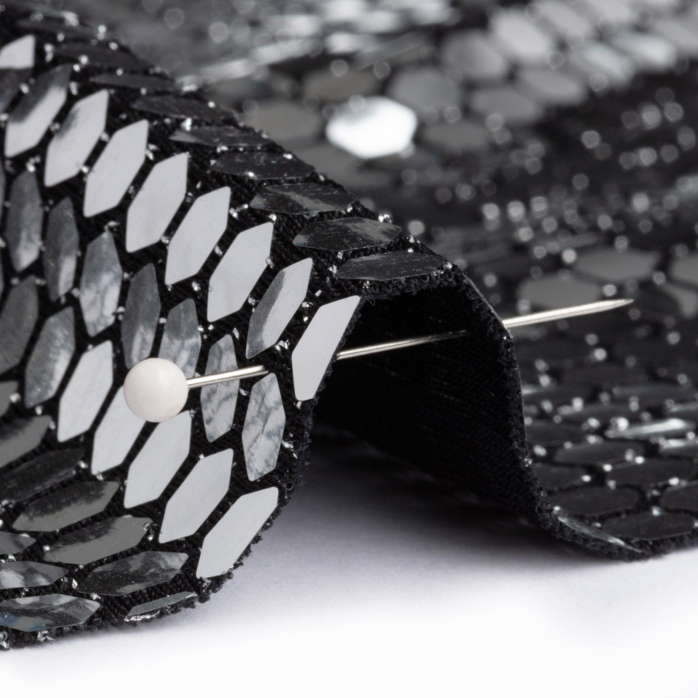 Make some fun memories in this Black and Silver Hexagons Foiled Stretch Nylon Knit! On a black nylon knit, shiny silver hexagons flash like strobe lights.
