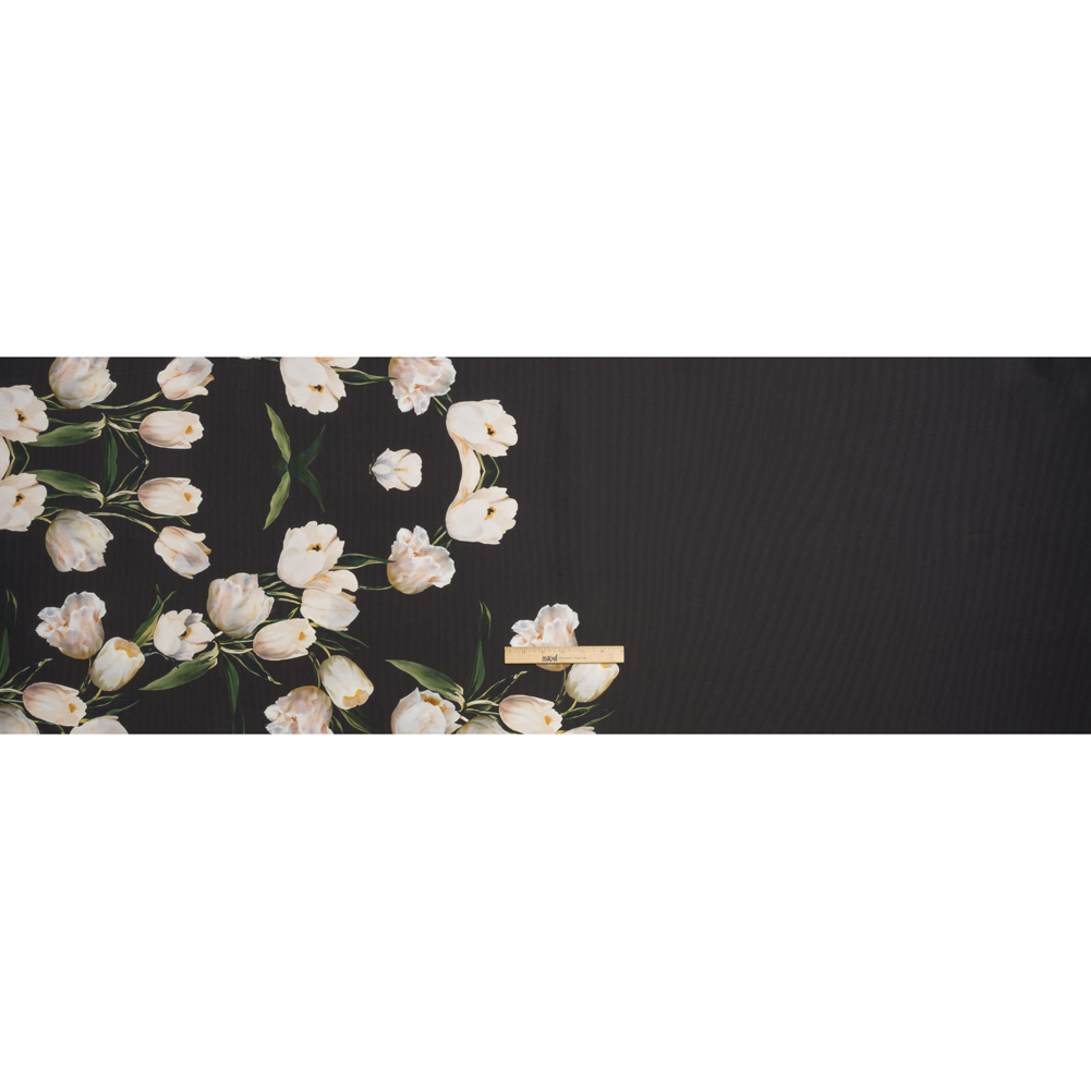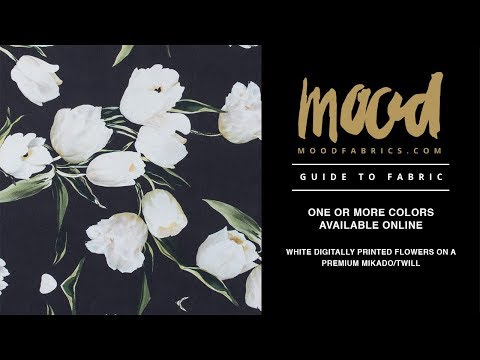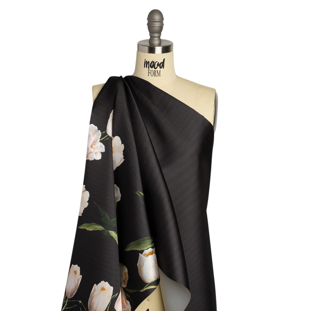 The digital world meets the natural world with this Premium Black and Whisper White Floral Digitally Printed Mikado. Tulips bloom over one another along one side of this smooth, luminous fabric. Commonly seen in bridal, Mikado has a silk-like hand and is stiffly woven creating a fuller drape. From stunning evening gowns to cocktail pieces, be the center of attention in any event. This piece is very slightly translucent when held up to the light and may require a lining.