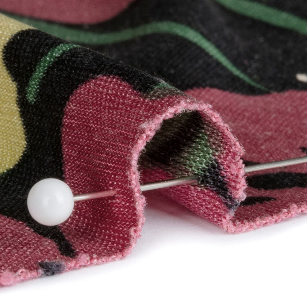 A bed of daisies lay peacefully in the darkened meadow of this Black, Dark Rose and Yellow Floral Silk Jersey. Shining lustrously in the light of the moon, take time to pick yourself a bouquet of red and yellow wildflowers. With this fabric featuring a smooth face, fluid drape, and a 50% weft-wise stretch, spending the dog days in style and in comfort has never been easier. Enjoy wearing airy wrap-around dresses, cool skater skirts, satiny tube tops, and more! Please note that this fabric is slightly translucent.